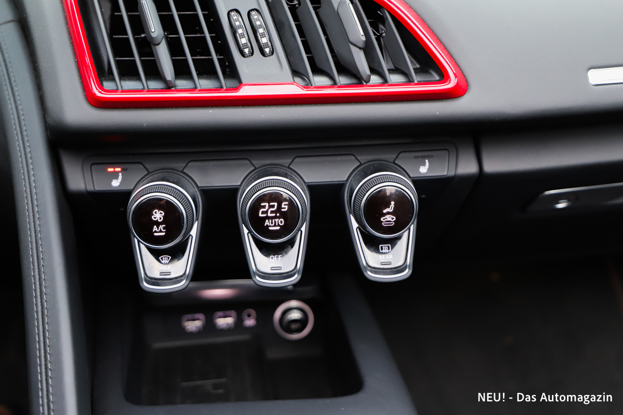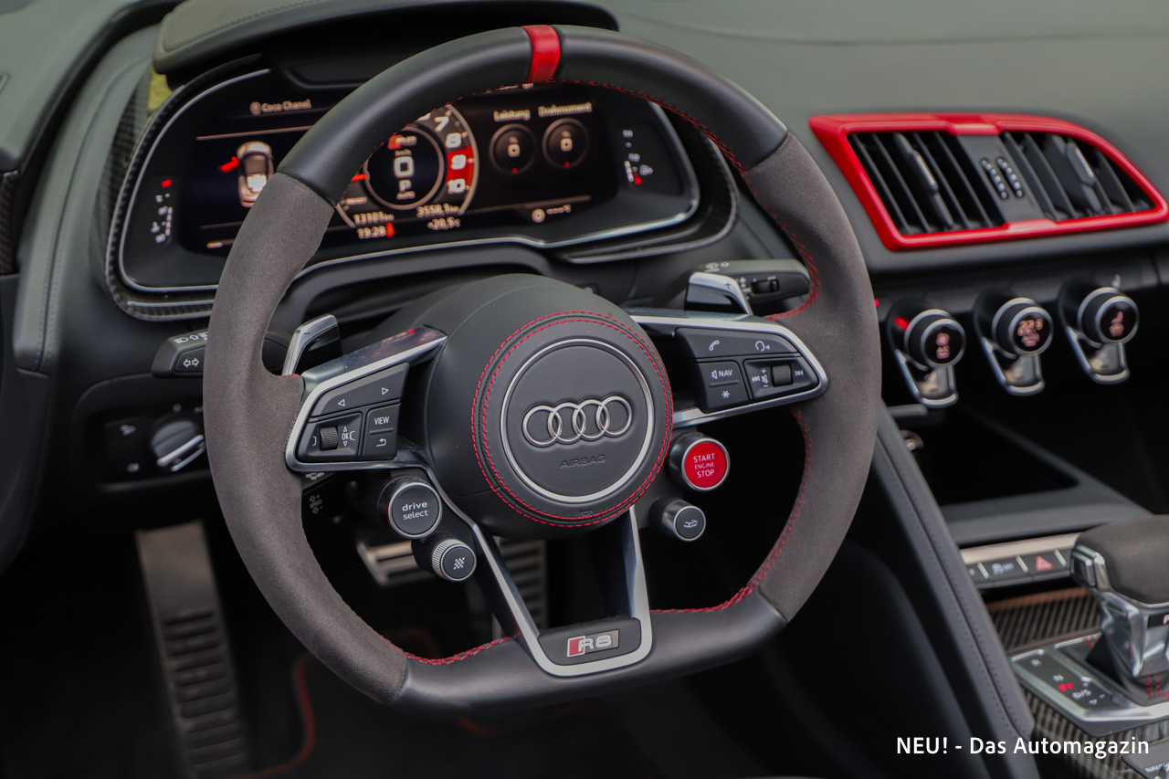 Besonders gelungen sind die sogenannten Bedien-Satelliten am Lenkrad. Dort sitzt unter anderem die Steuerung für die Klappenabgasanlage – ein kleines Detail, das im Alltag erstaunlich viel Bedeutung bekommt. Ein Knopfdruck entscheidet darüber, ob der R8 gerade höflich durch eine Ortschaft rollt oder sich akustisch bemerkbar macht, als wäre er auf dem Weg zu einem Vorsprechen.