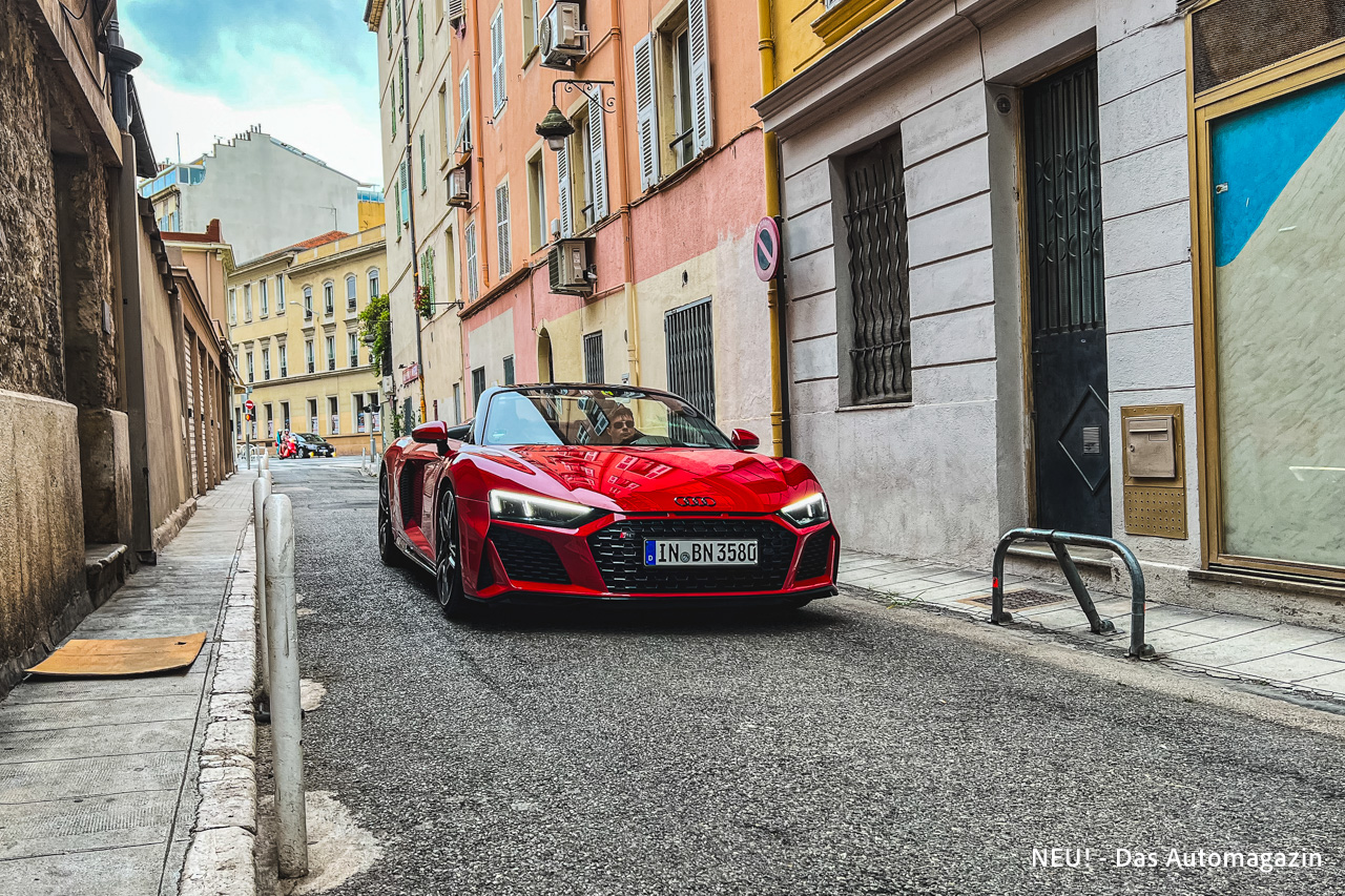 Das hat weniger mit Exklusivität zu tun als mit Ausstrahlung. Der R8 war nie der Lauteste im Raum, eher der, der sich sicher ist, dass er gar nicht laut sein muss. Als Spyder spielt ihm das zusätzlich in die Karten. Offen gefahren wirkt er weniger technisch als das Coupé (Test des Audi R8 V10 RWD), das mit seiner festen Linie einen Tick präziser, fast schon klinischer auftritt. Der Spyder dagegen nimmt diese Strenge raus und ersetzt sie durch etwas, das man auf deutschen Straßen selten braucht, an der Côte d’Azur aber plötzlich ziemlich logisch erscheint: Lässigkeit.