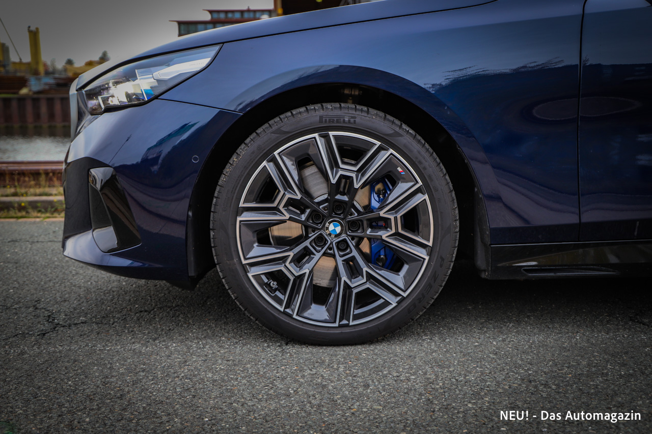 Die optionalen 20-Zoll-Leichtmetallräder im schwarz-grauen Bicolor-Design füllen die Radhäuser stimmig aus und verleihen dem Touring eine gewisse visuelle Präsenz, ohne dabei übertrieben sportlich wirken zu wollen. Das passt zur Gesamtcharakteristik des Fahrzeugs, das sich bewusst nicht als M3 Touring-Ersatz positioniert, sondern als komfortabler Full-Size-Kombi für die lange Strecke. In Kombination mit der Sonnenschutzverglasung entsteht eine Seitenansicht, die eher an eine verlängerte Limousine mit Ladeabteil erinnert als an einen klassischen Nutzkombi.