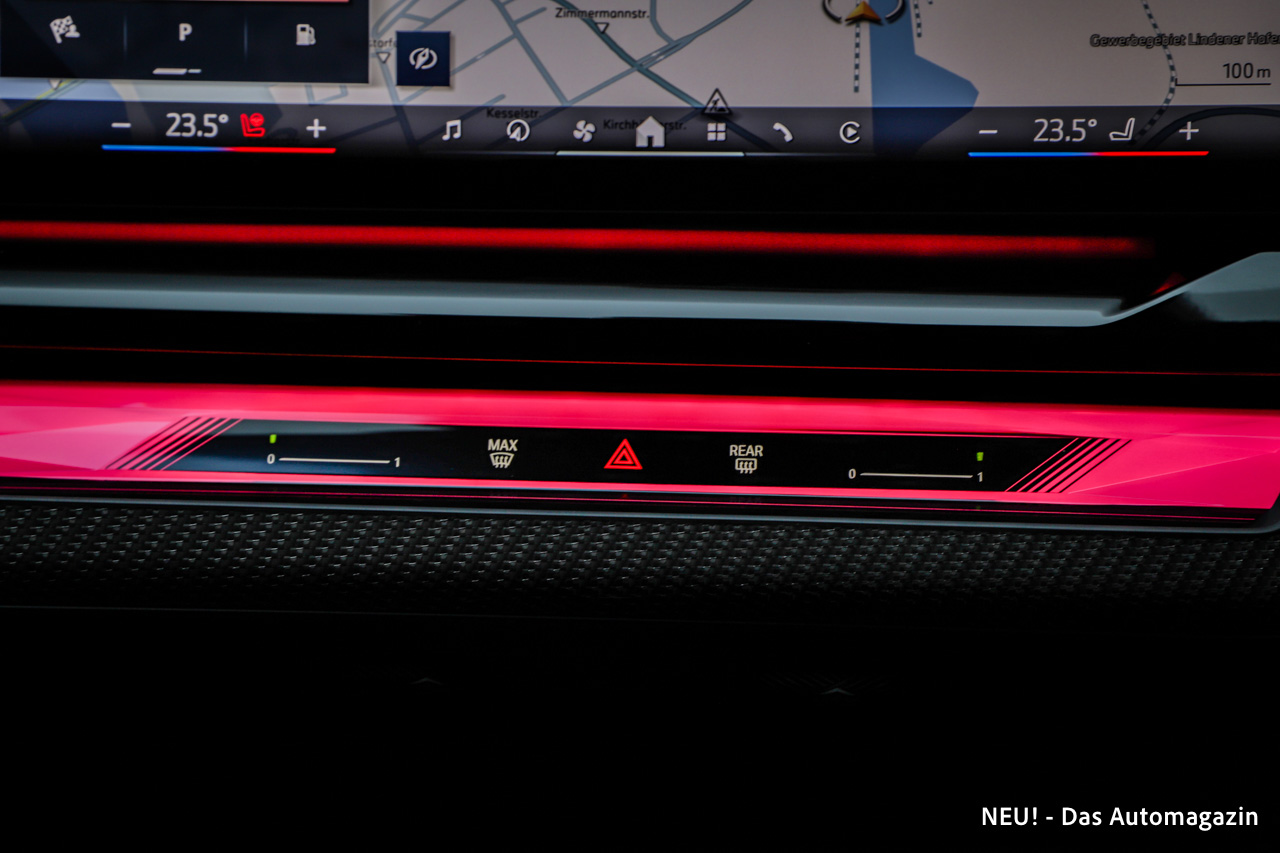 Unser Testwagen war zusätzlich mit dem optionalen Iconic Glow Exterieurpaket ausgestattet. Die beleuchtete Niere gehört sicherlich zu den diskutableren Designmerkmalen der aktuellen BMW-Generation, doch gerade im Dunkeln sorgt sie zusammen mit dem Welcome Light Carpet für einen inszenierten Zugang, der im Premiumsegment durchaus seine Berechtigung hat. Spielerei? Vielleicht. Effektvoll? Definitiv.