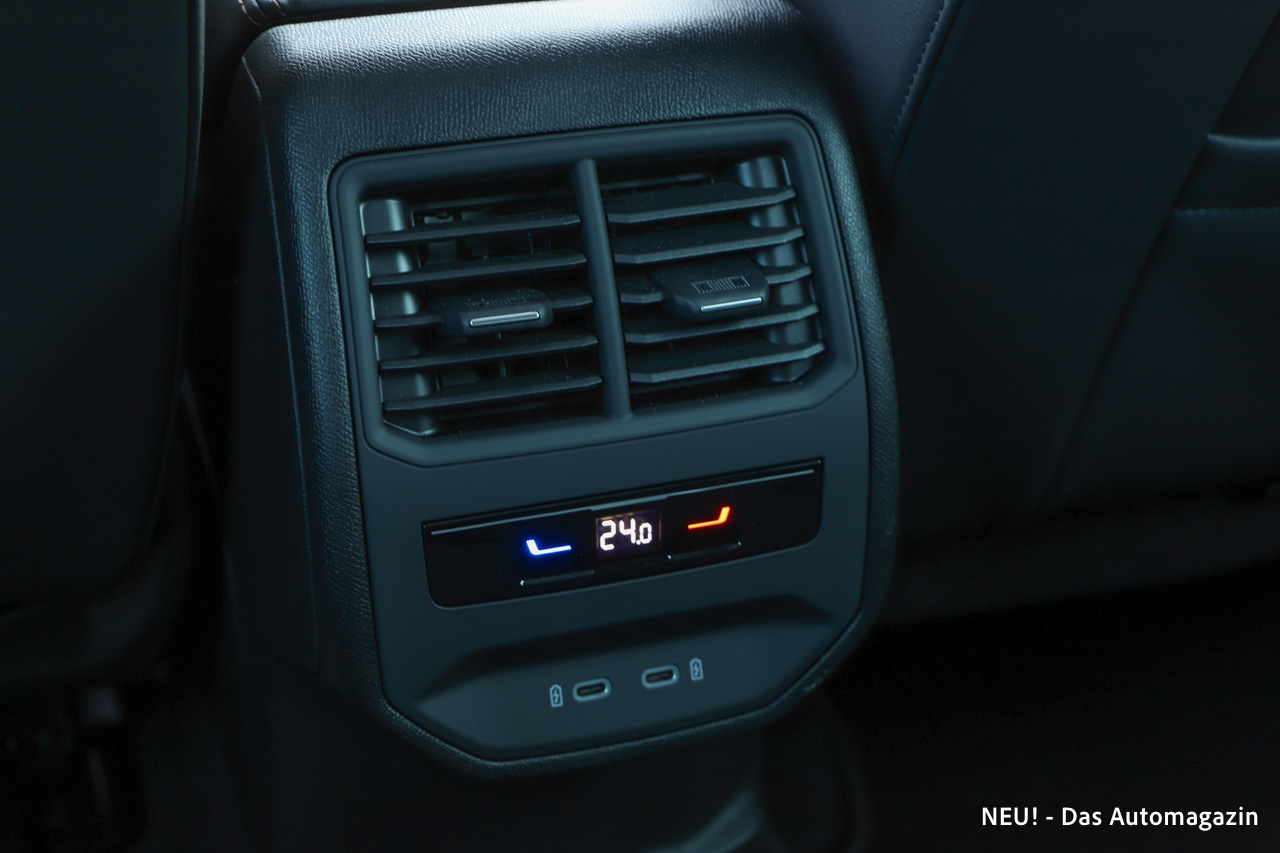 Drei-Zonen-Klimaautomatik, Voll-LED-Licht, ein digitales Cockpit und das große 12,9-Zoll-Infotainment sind immer an Bord. Dazu kommen Dinge wie Ambientebeleuchtung, ein beheizbares Sportlenkrad und ausreichend Ladeoptionen für alles, was heute zwingend mitgeführt werden muss. USB-C vorne und hinten, 12-Volt-Anschlüsse, dazu eine Konnektivität, die zuverlässig funktioniert. Kein Highlight, aber genau das ist hier die gute Nachricht.