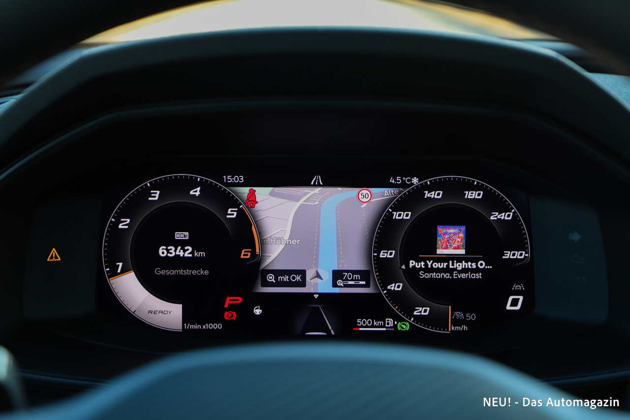 Auch das Ambiente passt. Die Sportsitze bieten ordentlichen Seitenhalt, ohne bei längeren Strecken auf die Nerven zu gehen, und die Materialauswahl vermittelt genau jene Mischung aus sportlichem Anspruch und solider Konzernlogik, die man in dieser Klasse erwartet. Der Formentor will innen nach wie vor kein Wohnzimmer auf Rädern sein, sondern eher ein modern eingerichteter Arbeitsplatz mit guter Haltung. Das gelingt ihm ziemlich überzeugend.