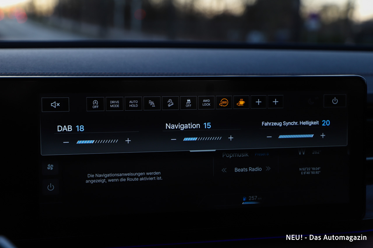 Das Infotainmentsystem präsentiert seine Inhalte auf einem großen zentralen Bildschirm und wirkt optisch angenehm aufgeräumt. Die Darstellung ist klar, die Grafiken sind modern und das integrierte Navigationssystem bindet Live-Verkehrsdaten ein. Im Alltag funktioniert das zuverlässig. Die Sprachführung besitzt allerdings eine ganz eigene Interpretation von Gelassenheit. Navigationsansagen werden so langsam ausgesprochen, dass man zwischendurch fast glaubt, die Stimme würde eine kleine Pause einlegen, um sich einen Tee zu kochen.
