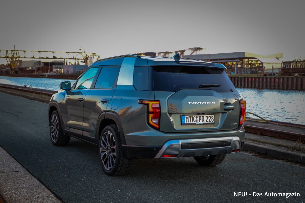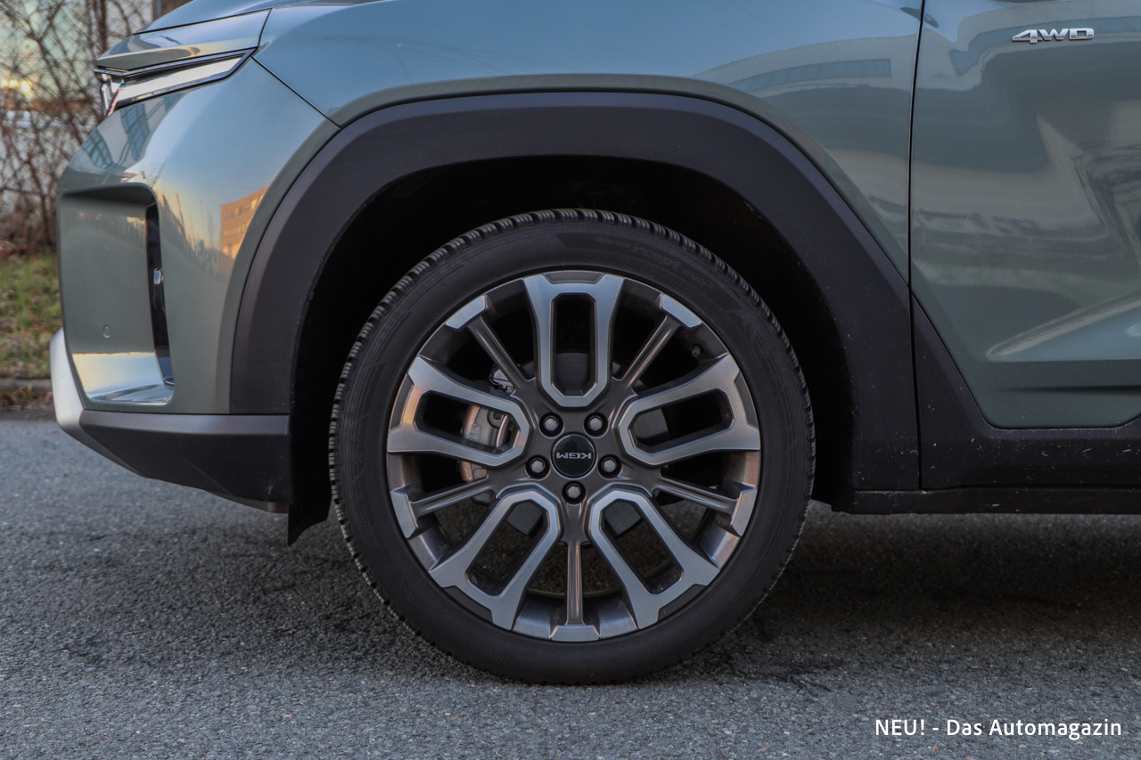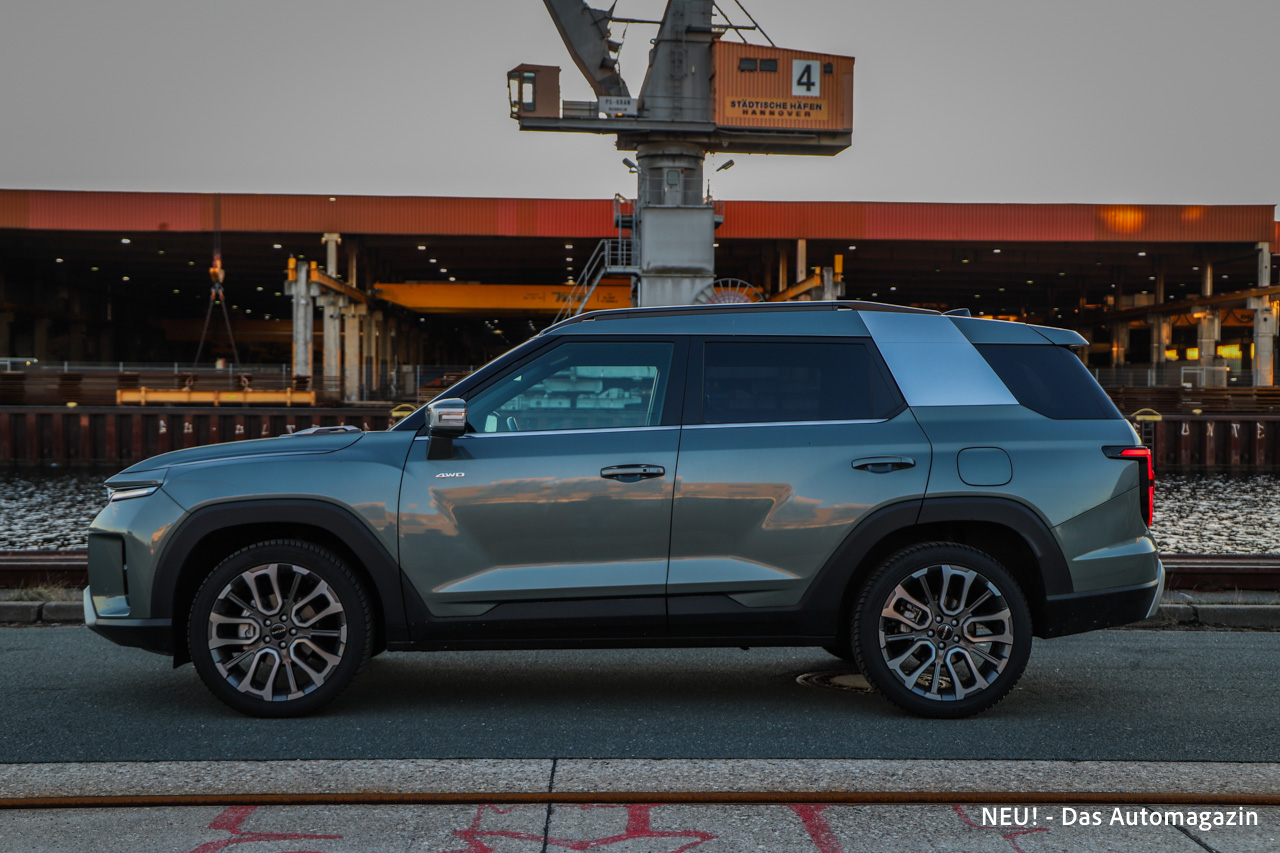 In der Seitenansicht zeigt sich, wie massiv der Torres tatsächlich wirkt. Die Karosserie baut hoch und breit, die Radhäuser sind stark ausgeprägt und die Kunststoffverkleidungen rund um die Radläufe sorgen für den typischen SUV-Look. Die 20-Zoll-Räder des Testwagens passen optisch sehr gut zu dieser Erscheinung. Kleinere Felgen würden hier vermutlich wirken, als hätte jemand bei der Bestellung den falschen Knopf gedrückt.
