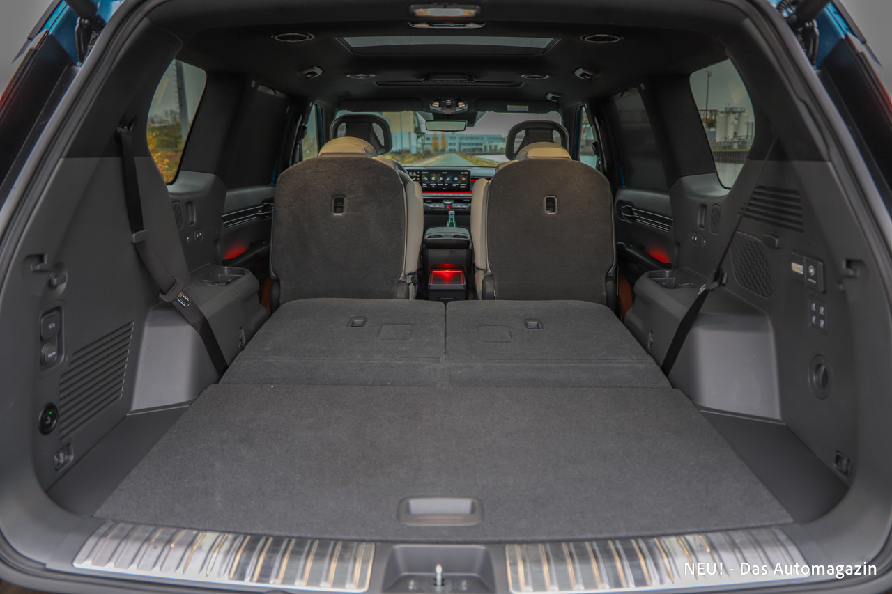 Kofferraumseitig präsentiert sich der EV9 weiterhin als echtes Raumwunder. Je nach Sitzkonfiguration variiert das Volumen stark, aber selbst mit allen sechs Plätzen in Nutzung bleibt genügend Platz für Gepäck. Wird die dritte Reihe reduziert genutzt oder umgelegt, entsteht ein fast schon vanartiger Stauraum, der die Alltagstauglichkeit eindrucksvoll unterstreicht.