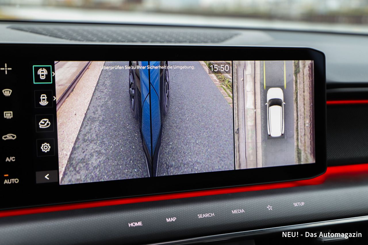 Der adaptive Tempomat arbeitet präzise und hält den Abstand sauber ein, selbst bei dichterem Verkehr. Die Spurführung gehört zu den besseren am Markt und greift angenehm zurückhaltend ein. Bei niedrigen Geschwindigkeiten erleichtert die 360-Grad-Kamera das Parken erheblich, da sie klare und gut perspektivierte Bilder liefert.