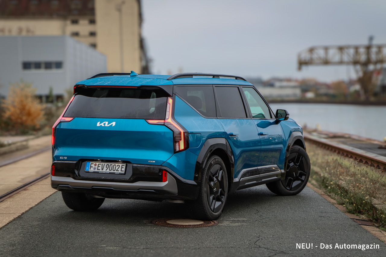 Der große Radstand und die ausgewogenen Proportionen lassen den EV9 imposant, aber nicht überzeichnet wirken. Die ausgeprägten Radhäuser und die hohen Fensterbänder tragen zur markanten Gesamterscheinung bei, während die 21-Zoll-Räder dem Wagen den nötigen sportlichen Ernst verleihen. Interessant ist, wie sehr die glatten Seitenteile den aerodynamischen Anspruch unterstreichen: Trotz des Ausmaßes wirkt der EV9 auf den zweiten Blick überraschend sauber modelliert.