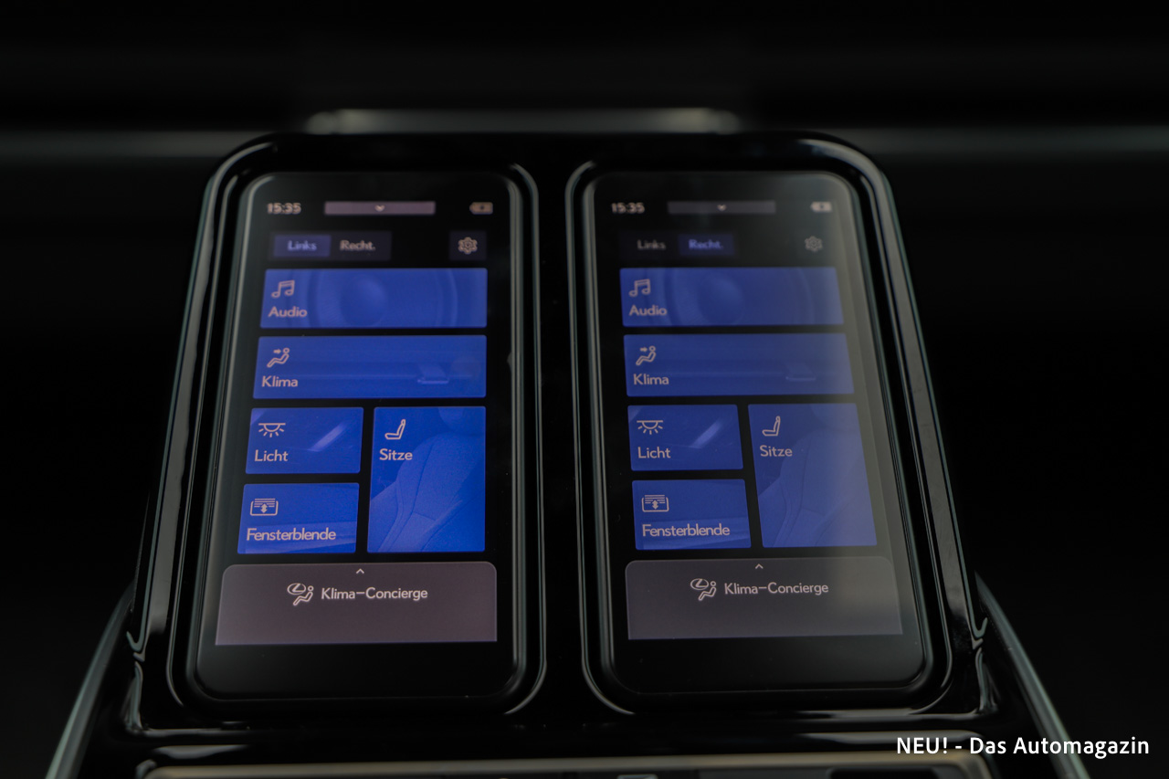 Materialseitig lässt sich wenig kritisieren. Die Oberflächen wirken hochwertig, sauber verarbeitet und durchdacht kombiniert. Kunststoff gibt es, aber nur dort, wo er nicht stört – und selbst dort wirkt er nicht billig. Interessant ist eher der Kontrast: Während hinten nahezu alles auf Komfort und Ruhe ausgelegt ist, erinnert der Arbeitsplatz vorn stark an andere Lexus-Modelle. Fahrer und Beifahrer könnten auch in einem Lexus UX (Test des Lexus UX 300h) sitzen, ohne dass ihnen etwas fehlen würde – außer vielleicht der Blick nach hinten, der deutlich macht, was ihnen gerade entgeht.