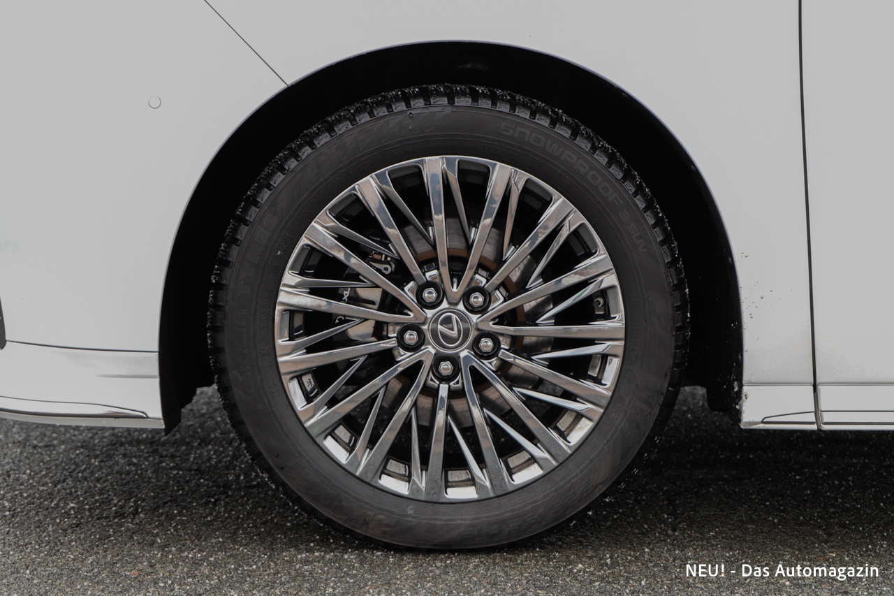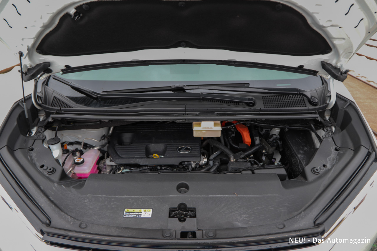 Unter der Haube des Lexus LM 350h arbeitet ein Antrieb, den man so oder so ähnlich bereits aus anderen Modellen des Toyota-Lexus-Konzerns kennt. Ein Vierzylinder-Vollhybrid, kombiniert mit einem stufenlosen Getriebe und in diesem Fall serienmäßigem Allradantrieb („E-Four“). Auf dem Papier stehen rund 250 PS Systemleistung. Das klingt zunächst solide, wirkt in diesem Fahrzeugkonzept aber fast schon wie eine bewusste Gegenposition zum Rest des Autos.