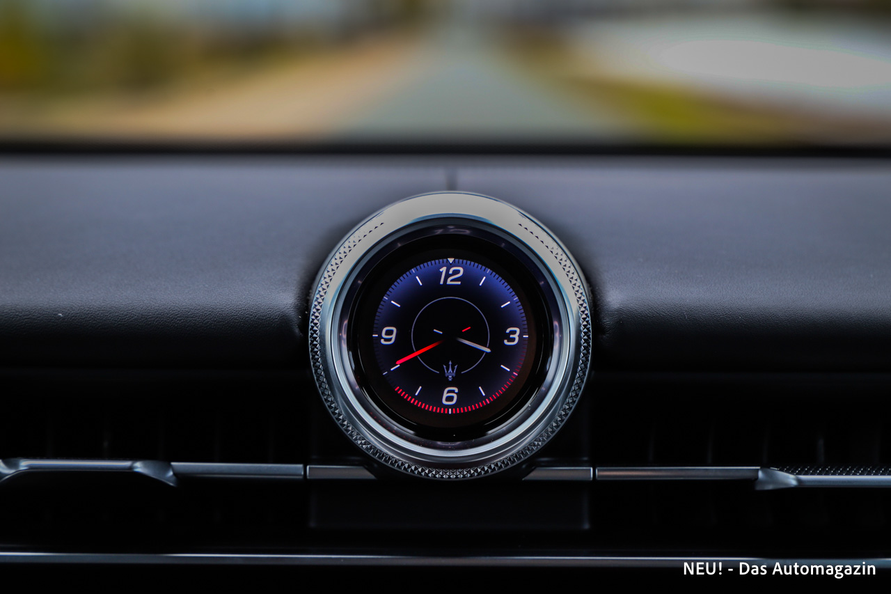 Schon beim Öffnen der Tür wird klar, dass Maserati die Innenräume moderner interpretiert als früher. Der Trofeo setzt auf Digitalität: ein volldigitales Cockpit, ein zentrales Touchdisplay, ein weiteres Display darunter für Klima und Fahrzeugfunktionen und eine digitale Version der legendären Maserati-Uhr.