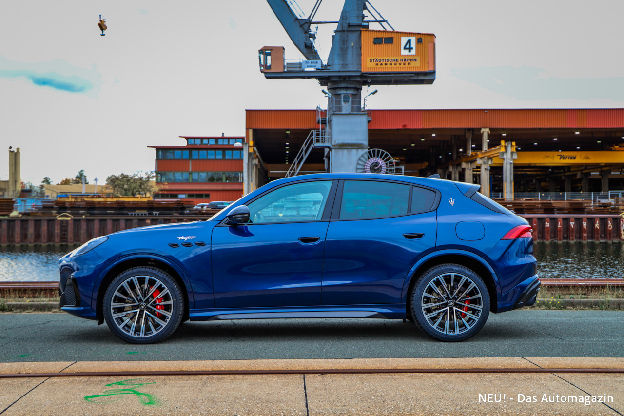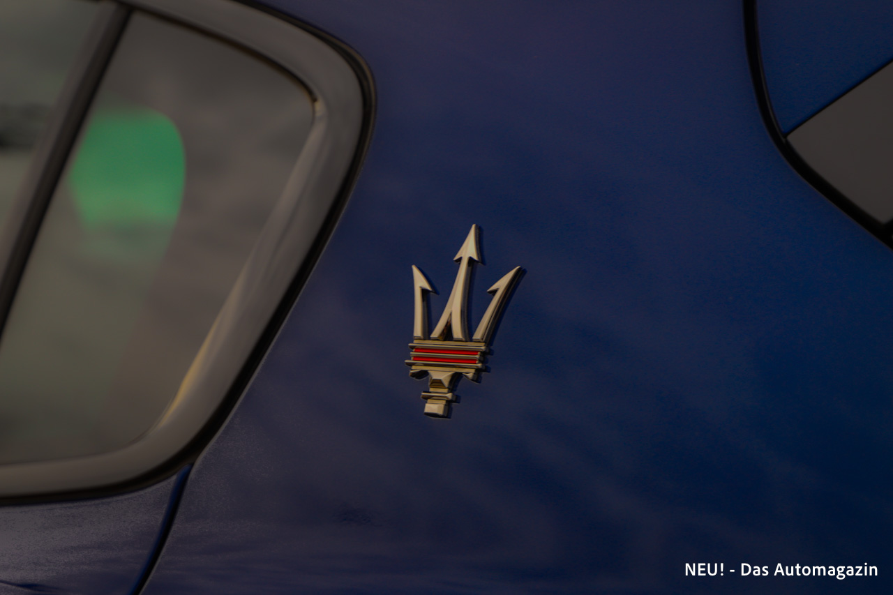 Maserati hat den Grecale als kompakten Bruder des Levante positioniert, aber der Trofeo wirkt nicht nur optisch wie eine eigenständige Baureihe, sie ist es auch. Der Levante (Test des Maserati Levante GTS) wurde mittlerweile eingestellt. Blu Intenso ist eine der Farben, die man live gesehen haben muss, um den Effekt zu verstehen: tief, elegant, nicht aufdringlich, aber eben Maserati. Die 21-Zoll-Schmiederäder im Pegaso-Design wirken wie maßgeschneiderte Accessoires für das Auto, sportlich ohne Übertreibung.