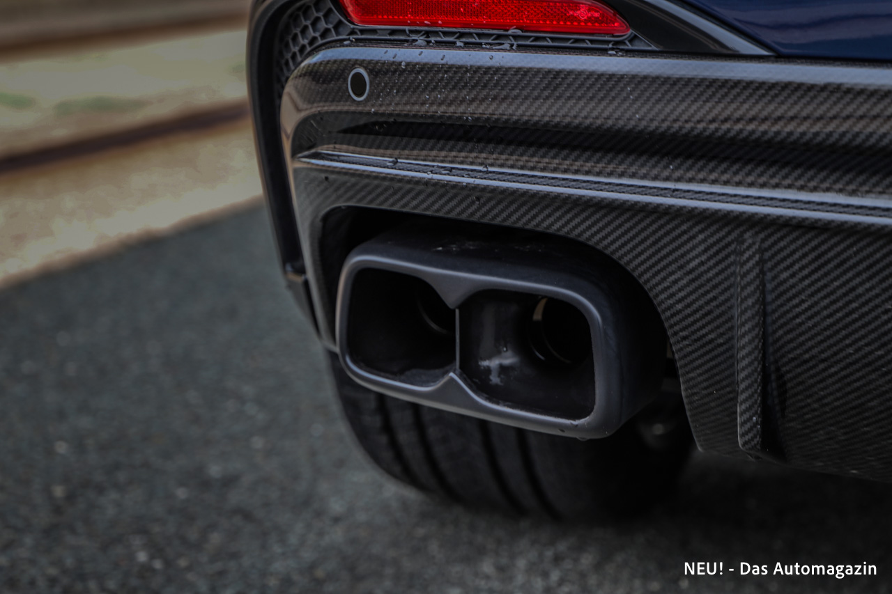 Der Trofeo unterscheidet sich klar von den schwächeren Varianten. Eigene Stoßfänger vorne und hinten, seitliche Carbon-Schweller, große Lufteinlässe, eine Motorhaube mit klarer Betonung des V6 darunter. Besonders auffällig sind die vier schwarz ausgeführten Endrohre. Maserati hat sie nicht zufällig so gestaltet. Die Form erinnert tatsächlich an frühere AMG-V12-Modelle wie den SL 65 – und das ist eine mehr oder weniger bewusste Reminiszenz an Zeiten, in denen Auspuffdesign zum Charakter eines Autos beitrug.