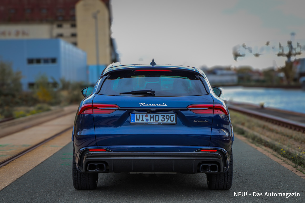 Von hinten wirkt der Grecale Trofeo breiter, als er real ist. Die schmalen Rückleuchten ziehen den Blick nach außen, die Proportionen wirken sportlich, nicht wuchtig. Ein Auto, das nicht auf Größe setzt, sondern auf Ausstrahlung. Die Plattform teilt er mit dem Alfa Romeo Stelvio Quadrifoglio, und die Verwandschaft zeigt sich in der Silhouette: dynamisch, leicht geduckt, mit einer sauberen Schulterlinie.