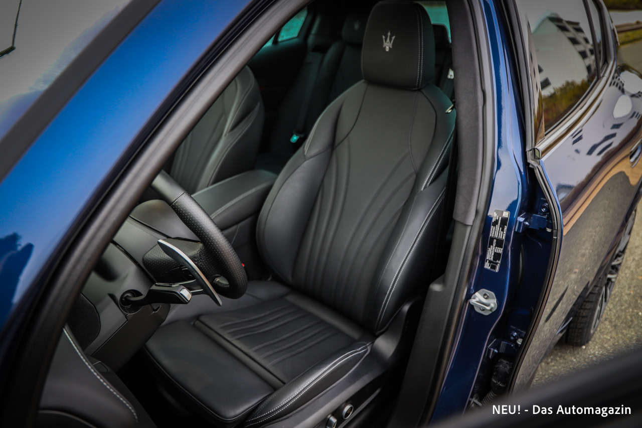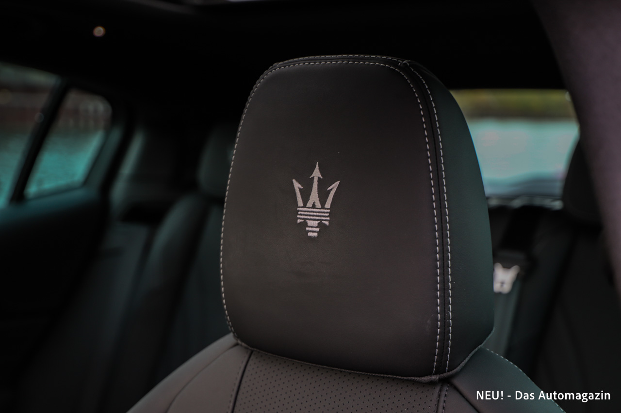 Der Materialmix ist hochwertig. Viel Leder, fein verarbeitet, kombiniert mit Carbon im 3D-Effekt. Das ergibt optisch Tiefe und zeigt, dass Maserati auch im Detail Wert auf Einzigartigkeit legt. Die Sitze sind sportlich, gleichzeitig langstreckentauglich, mit ausreichend Seitenhalt und verstellbaren Wangen. Der schwarze Innenraum mit grauen Kontrastnähten wirkt edel, ohne steril zu sein.