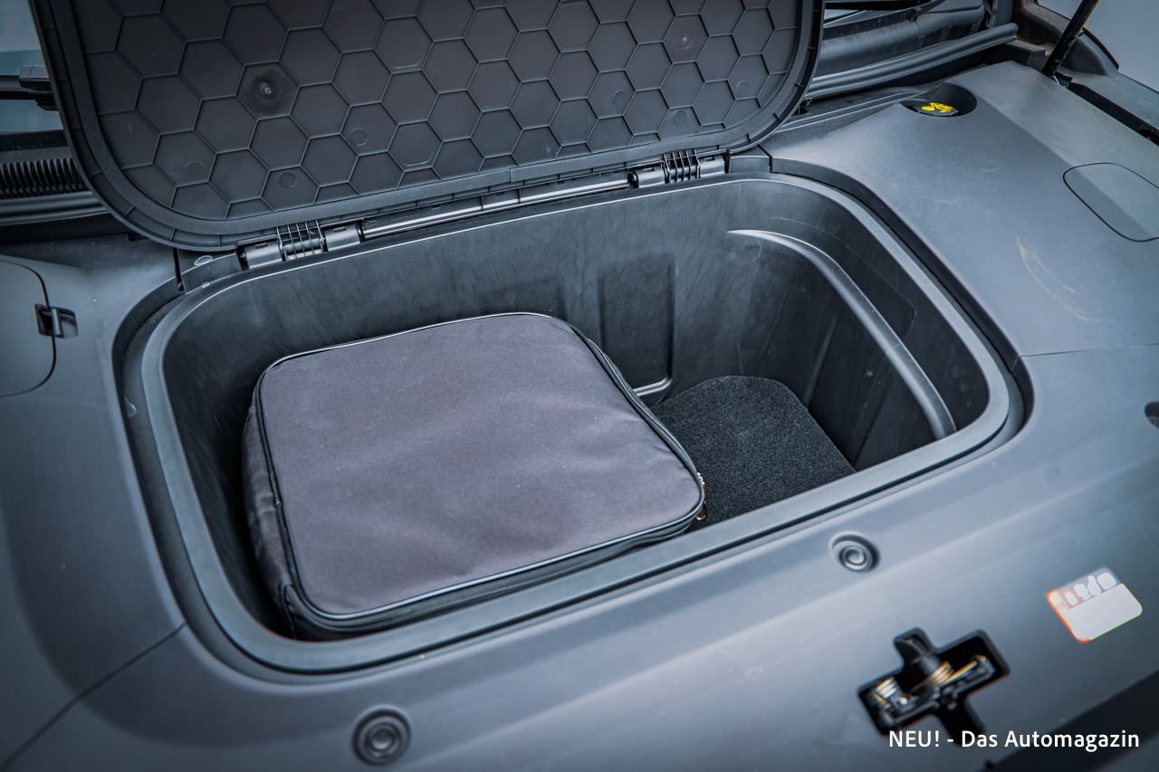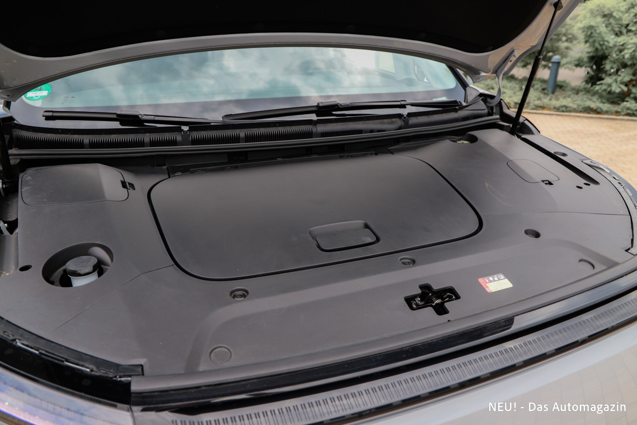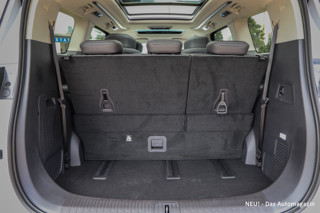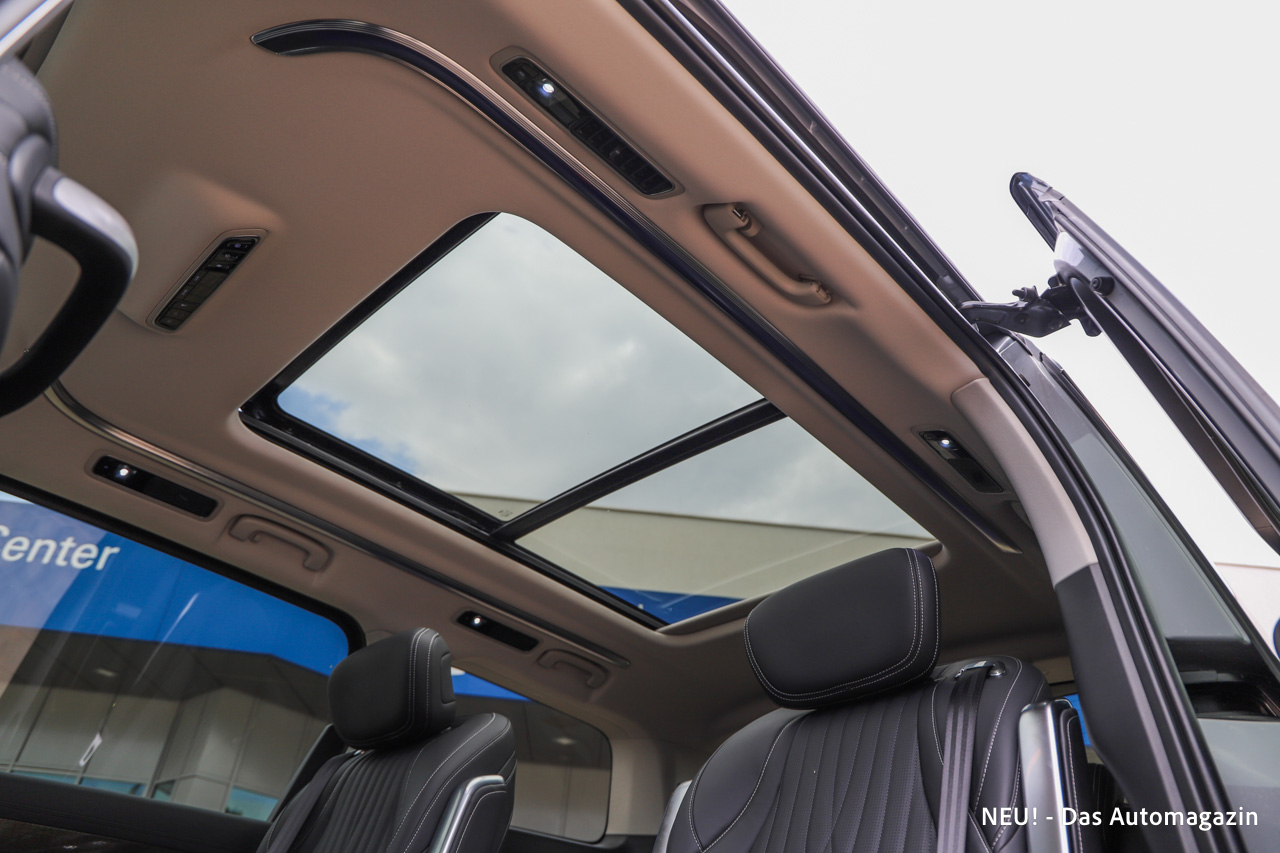 Ein besonderes Highlight ist die Dachgestaltung. Sowohl im Fond als auch vorne stehen Glasdächer zur Verfügung, die sich öffnen lassen und den Innenraum hell und luftig wirken lassen. Der Kofferraum bietet selbst bei voller Bestuhlung noch alltagstauglichen Stauraum und lässt sich bei Bedarf deutlich erweitern. Ergänzt wird das Raumangebot durch einen Frunk unter der Fronthaube.
