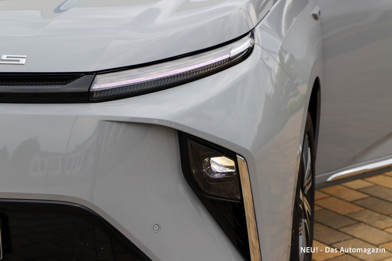 Optisch setzt der Maxus Mifa 9 auf einen futuristischen Ansatz, der sich klar von klassischen Vans abgrenzt. Die Front wirkt modern und selbstbewusst, geprägt von klaren Linien und einer ungewöhnlichen Lichtsignatur. Die zweigeteilten LED-Scheinwerfer integrieren sich unauffällig in die Frontgestaltung und verleihen dem Fahrzeug einen technisch geprägten Ausdruck. Insgesamt wirkt der Auftritt weniger funktional als vielmehr repräsentativ, was den Anspruch des Modells unterstreicht.