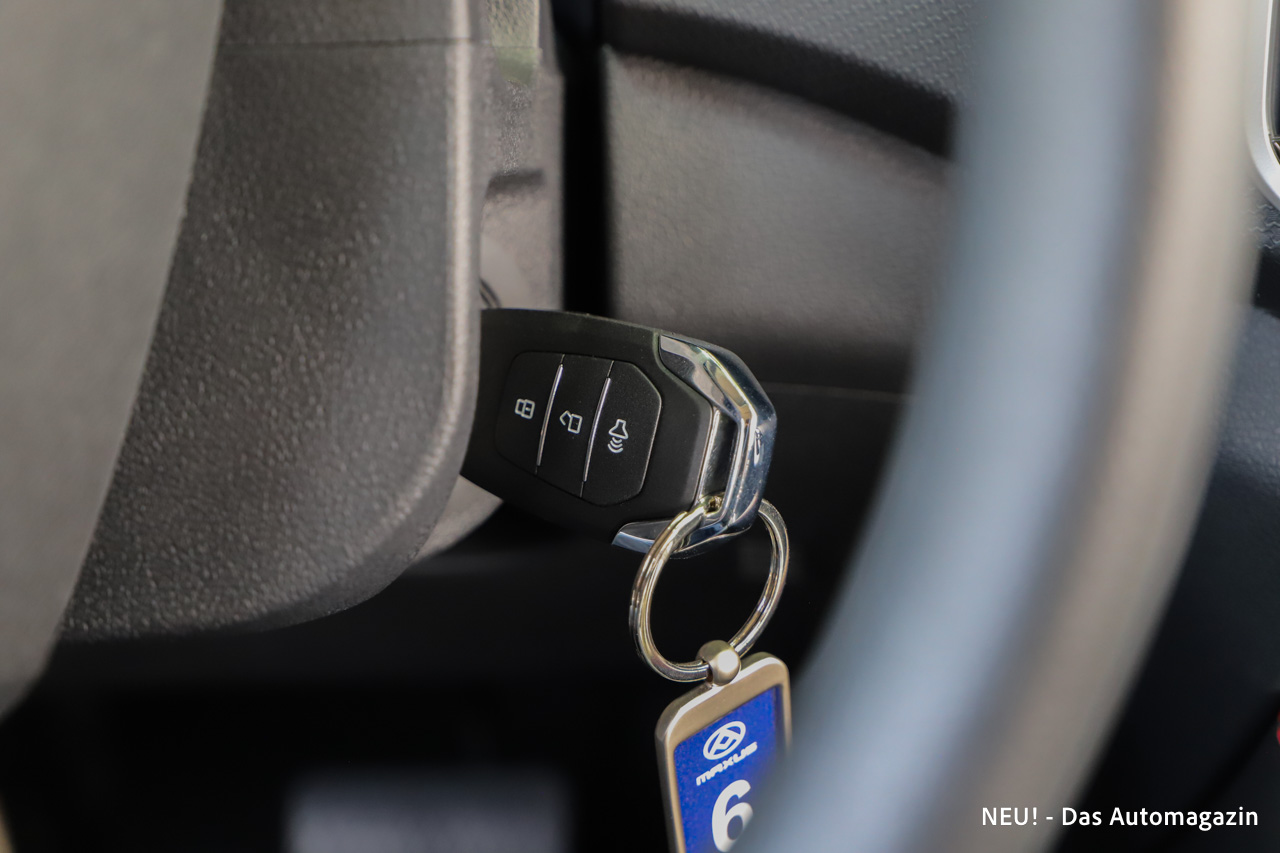 Auf Komfortmerkmale wie ein schlüsselloses Zugangssystem verzichtet der Maxus T90 EV. Der Fahrzeugschlüssel muss klassisch ins Zündschloss eingeführt werden.