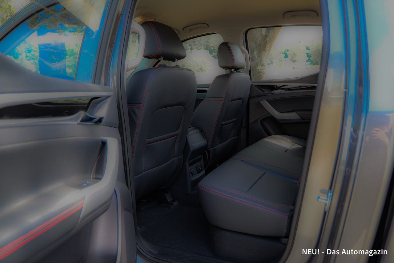 Die Sitzposition fällt pick-up-typisch erhöht aus und bietet eine gute Rundumsicht im Stadtverkehr. Seitenhalt ist hingegen – wie in dieser Fahrzeugklasse üblich – nur begrenzt vorhanden. Das Platzangebot auf den vorderen wie hinteren Sitzplätzen geht insgesamt in Ordnung und erlaubt auch längere Strecken mit mehreren Insassen.