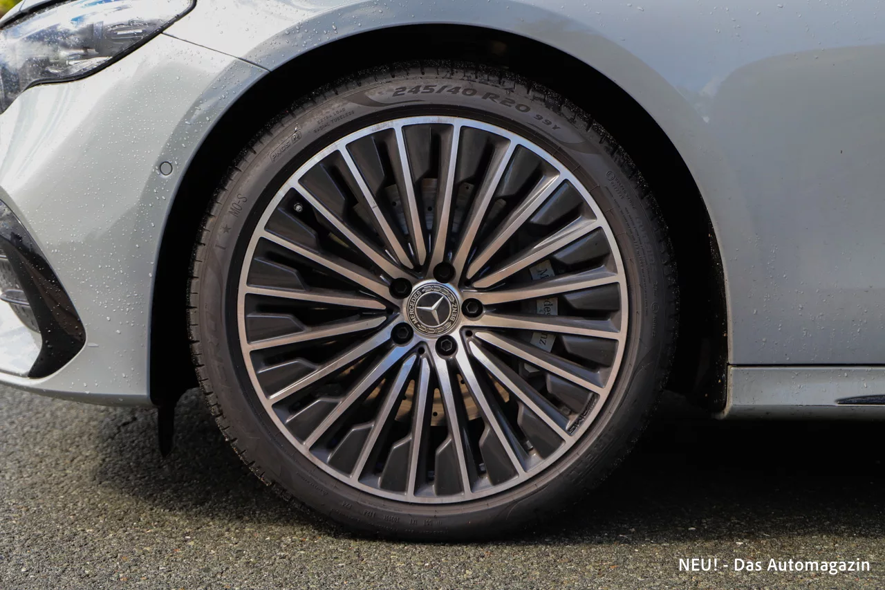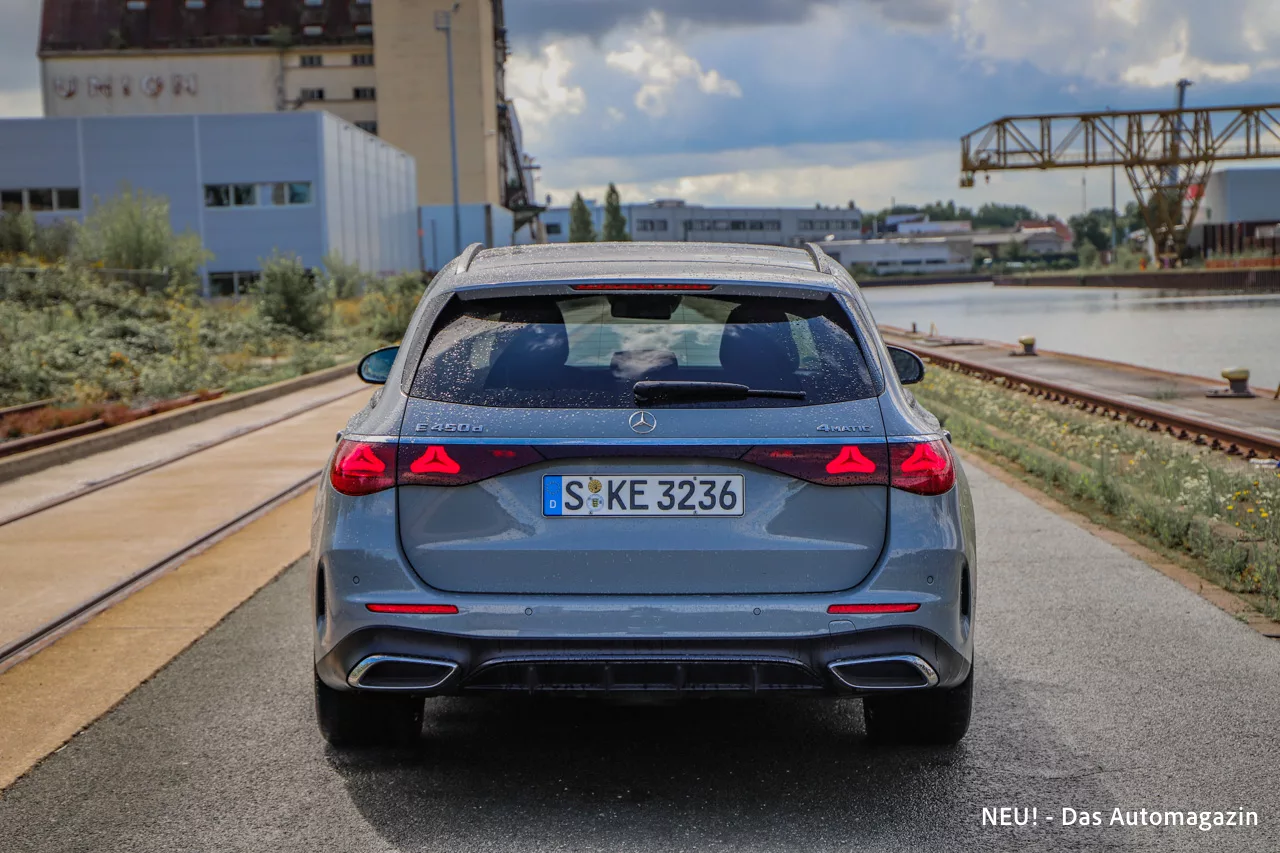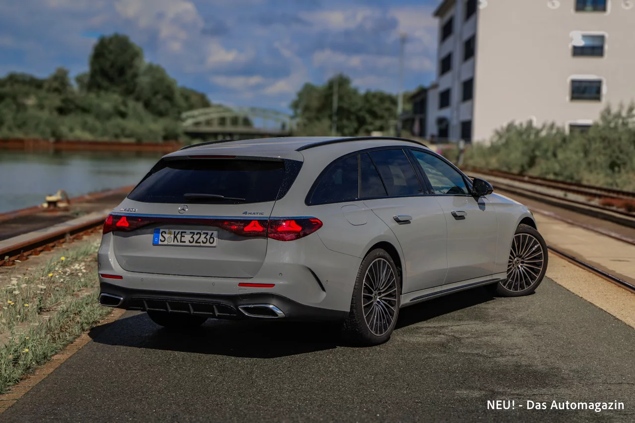 Unser Testwagen, lackiert im sehr exklusiven Alpingrau Uni, zeigt, wie viel Wirkung eine Farbe haben kann, selbst wenn sie nahezu komplett auf Glamour verzichtet. Der Ton gibt dem Kombi eine fast militärische Ernsthaftigkeit, während Chromdetails und die glatte Linienführung die gewünschte Noblesse beisteuern. Von der Seite betrachtet, wirkt der E 450d lang, ruhig und nahezu majestätisch. Die leicht ausgestellten Radhäuser, die cleanen Flächen und die bündig ausfahrenden Türgriffe lassen gleichzeitig Modernität und Understatement zu. Die 19-Zöller unseres Testwagens verleihen dem Auftritt sportliche Substanz, ohne den Komfortanspruch infrage zu stellen. Am Heck wiederholt sich die neue Lichtsignatur mit den leuchtenden Sternmustern, die im Dunkeln mehr Kunstinstallation als Rückleuchte sind.