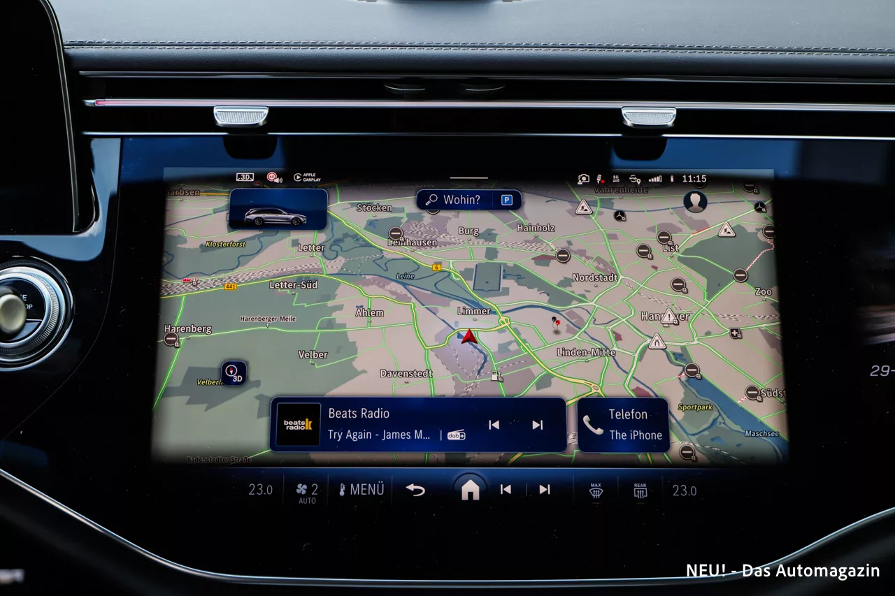 Die zusätzlich auf die Straße projizierten Symbole – etwa Pfeile oder Warnhinweise – wirken futuristisch und nützlich zugleich. Ebenfalls stark präsentiert sich die 360-Grad-Kamera, die mit ihrer extrem hohen Auflösung tatsächlich ein Gefühl von Echtzeit-Überblick vermittelt. Für enge Parkhäuser oder unübersichtliche Ausfahrten ist sie ein spürbarer Vorteil. Die Assistenzsysteme arbeiten – typisch Mercedes – weitgehend unauffällig und entspannt. Nur die Geschwindigkeitswarnung wurde schnell deaktiviert, da sie im Alltag eher störte als half. Erwähnenswert ist das Beifahrer-Display, das aufgrund seiner hohen Auflösung und klaren Darstellung selbst Passagiere beschäftigte, die sonst kaum Interesse an Fahrzeugtechnik haben. YouTube, Navigation oder Widgets – während der Fahrt sieht der Fahrer nur eine dunkle Fläche, aber akustisch ist alles präsent. Auch das optionale Burmester-System spielt eine große Rolle im Gesamterlebnis.