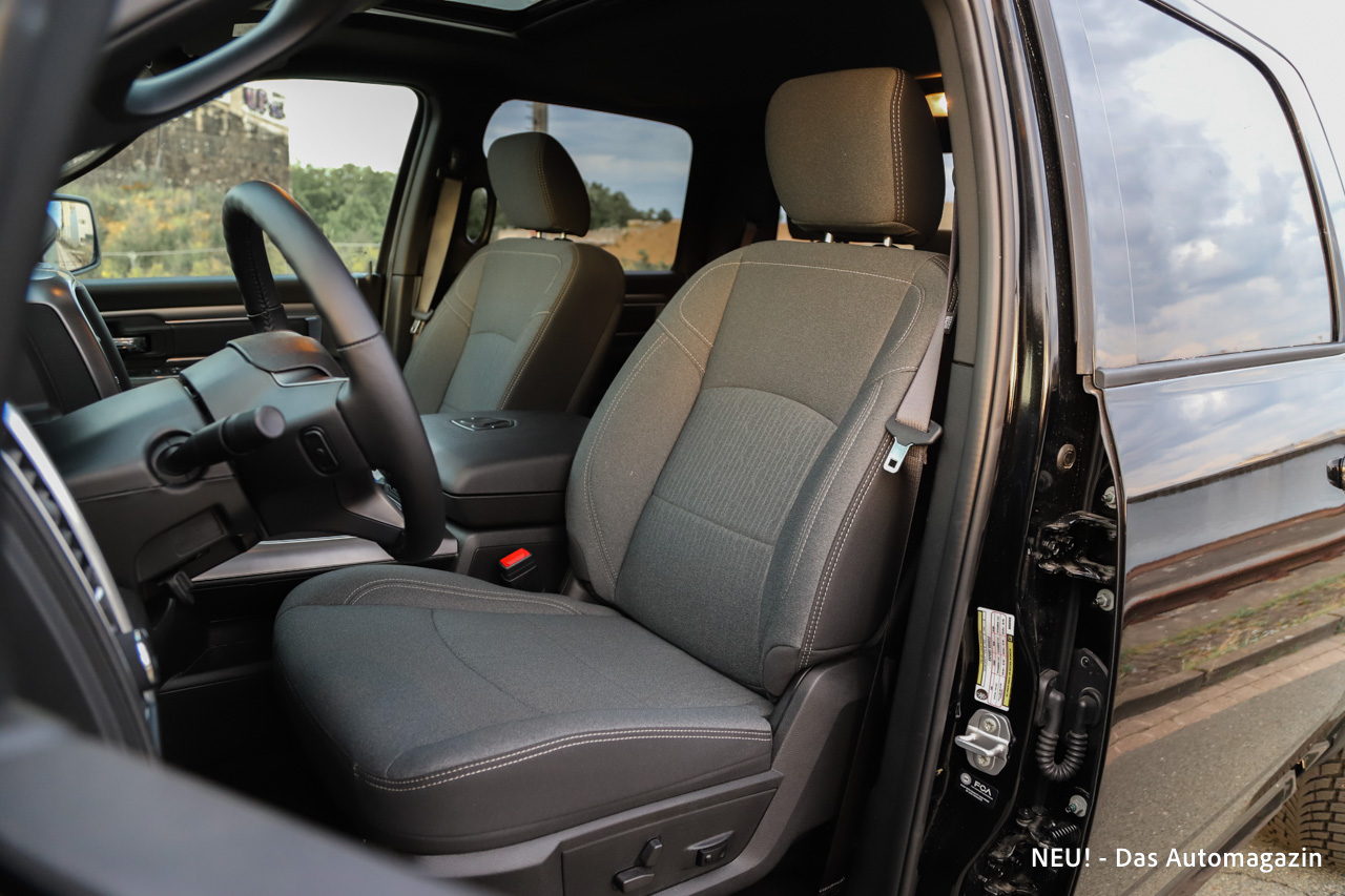 Im Innenraum setzte der RAM 1500 Classic auf Funktionalität und Raumgefühl statt auf Luxus. Während andere RAM-Varianten mit Leder und großen Displays aufwarteten, zeigte sich der Classic bewusst bodenständig. Die Sitze bestanden aus Stoff, boten hohen Komfort, jedoch nur begrenzten Seitenhalt. Dafür überzeugten sie mit Bequemlichkeit auf langen Strecken und ausreichend Platz für alle Insassen.