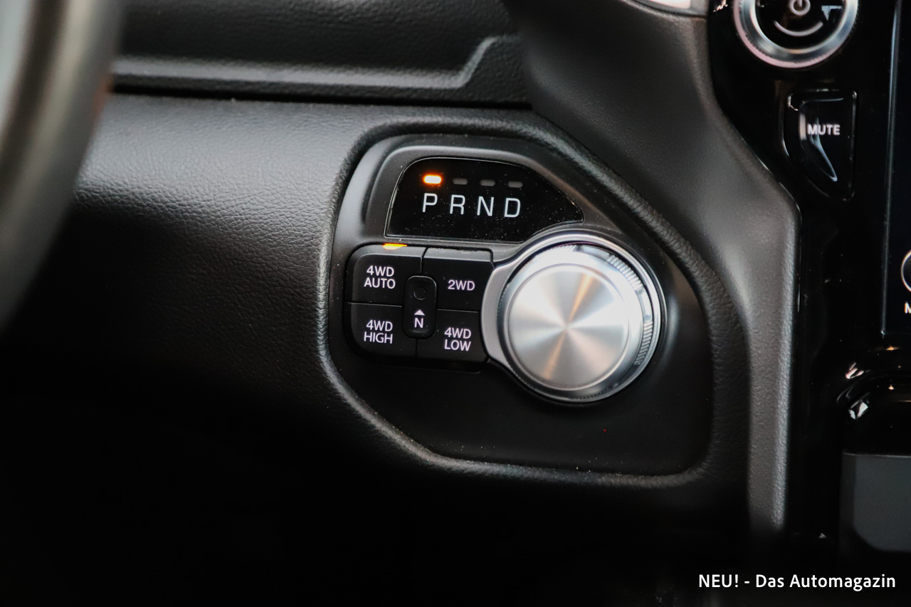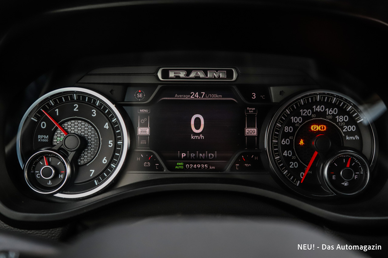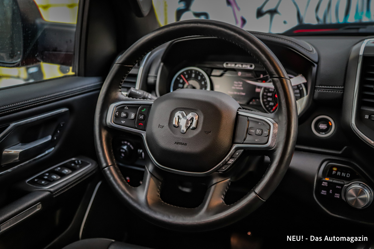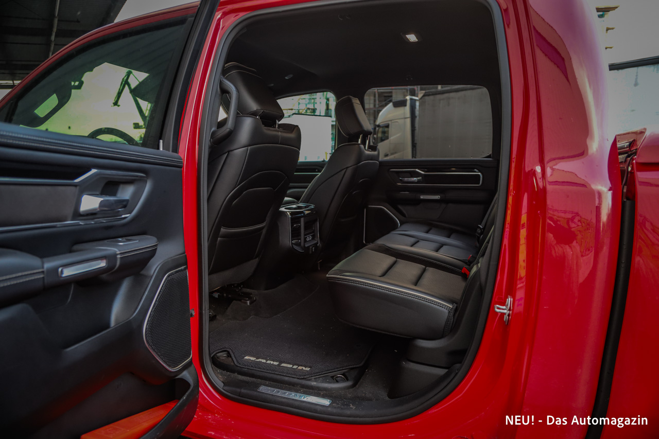 Im Kern bleibt der RAM jedoch ein Komfort-Pick-up. Der Innenraum überzeugt mit Leder, belüfteten und beheizten Sitzen sowie viel Raum auf beiden Reihen. Die Lässigkeit, mit der fünf Personen reisen können, ist in dieser Klasse ein echtes Argument. Auch die Assistenz- und Komfortausstattung wirkt im Alltag nicht exotisch, sondern zeitgemäß. Rückfahrkamera, Totwinkel- und Querverkehrswarner sowie Notbremsfunktionen passen gut zu den Abmessungen.
