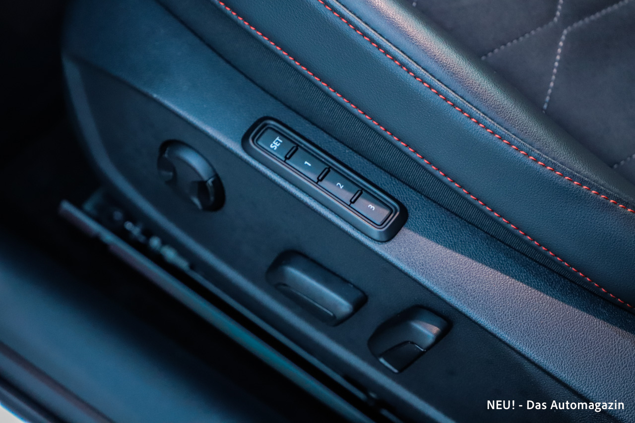Im Innenraum zeigt sich der Seat Leon Sportstourer Hybrid erwartungsgemäß aufgeräumt, ohne steril zu wirken. Gerade in der FR-Ausstattung gelingt die Balance aus sportlichem Anspruch und Alltagstauglichkeit. Das Dynamica-Paket bringt straffer konturierte Sitze mit, die nicht nur optisch etwas mehr Halt versprechen, sondern diesen auch tatsächlich liefern. In Kombination mit der elektrischen Sitzverstellung samt Memory-Funktion auf der Fahrerseite entsteht schnell eine ergonomisch sinnvolle Sitzposition, die auch auf längeren Strecken nicht zur Belastungsprobe wird.