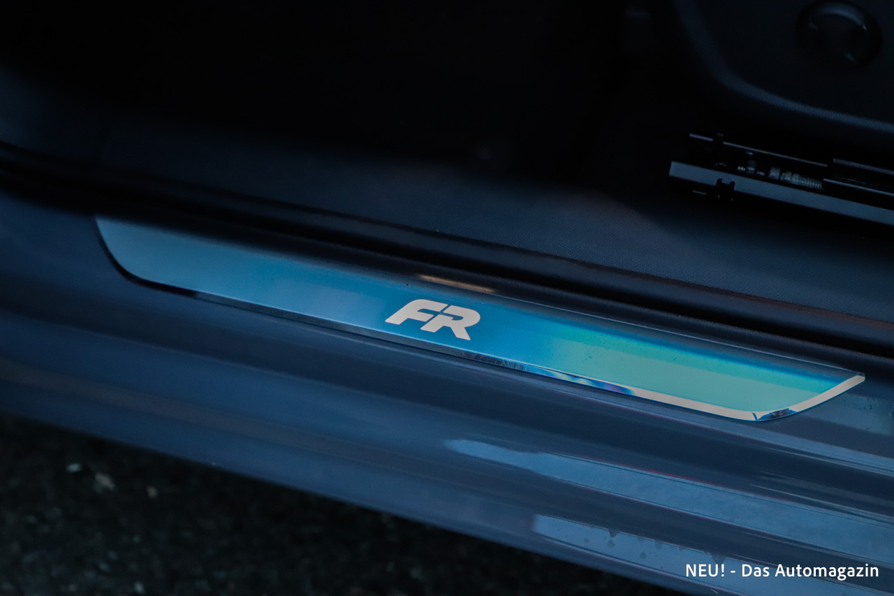 In Graphene Grau kommt die Linienführung besonders gut zur Geltung. Die leicht ansteigende Gürtellinie, die straffe Schulterpartie und die kurzen Überhänge sorgen auch beim Kombi für eine gewisse visuelle Spannung. Unterstützt wird dieser Eindruck durch die 18 Zoll großen „Performance I“ Felgen, die den Radkästen ausreichend Präsenz verleihen, ohne den Komfortgedanken zu konterkarieren. Das FR-spezifische Exterieur mit seinen schärfer gezeichneten Stoßfängern fügt sich dabei stimmig ins Gesamtbild ein.