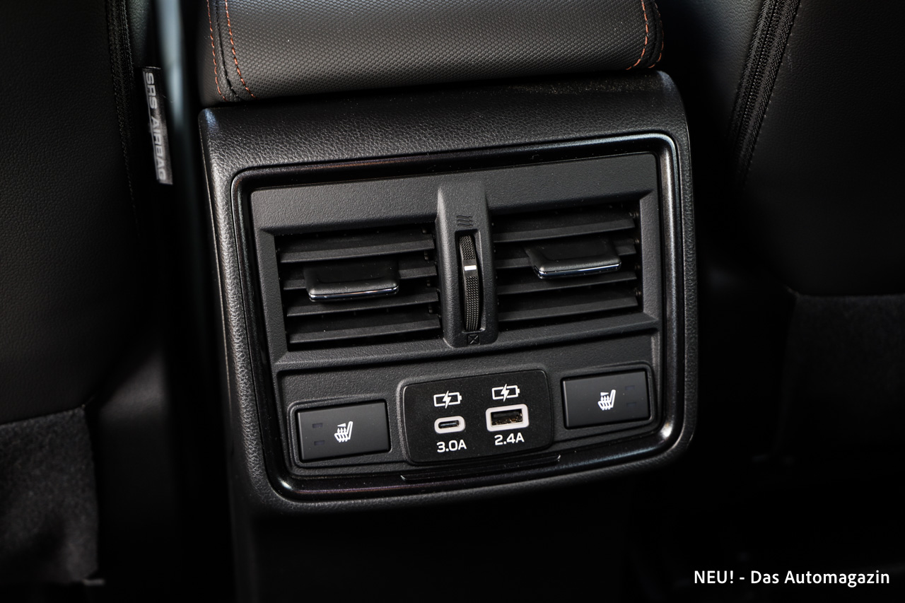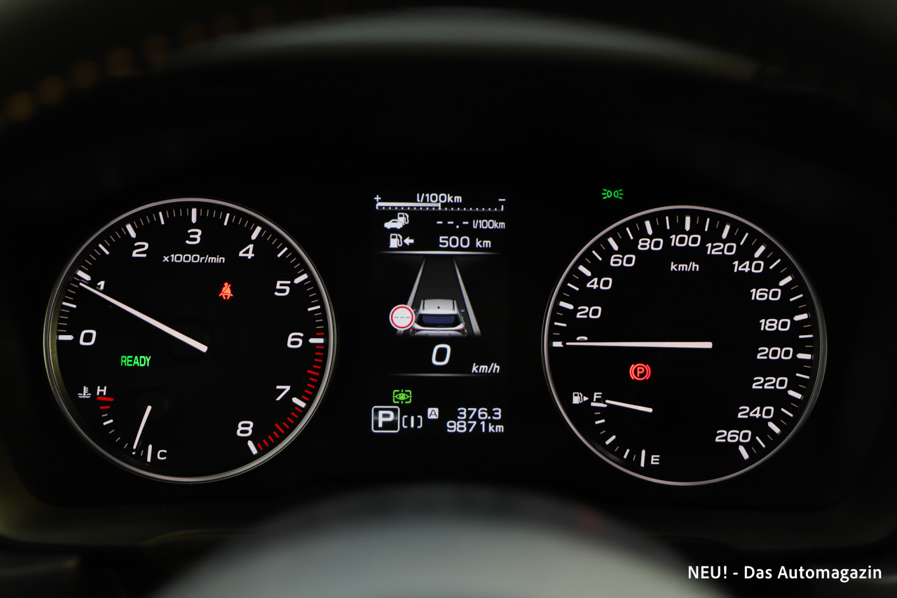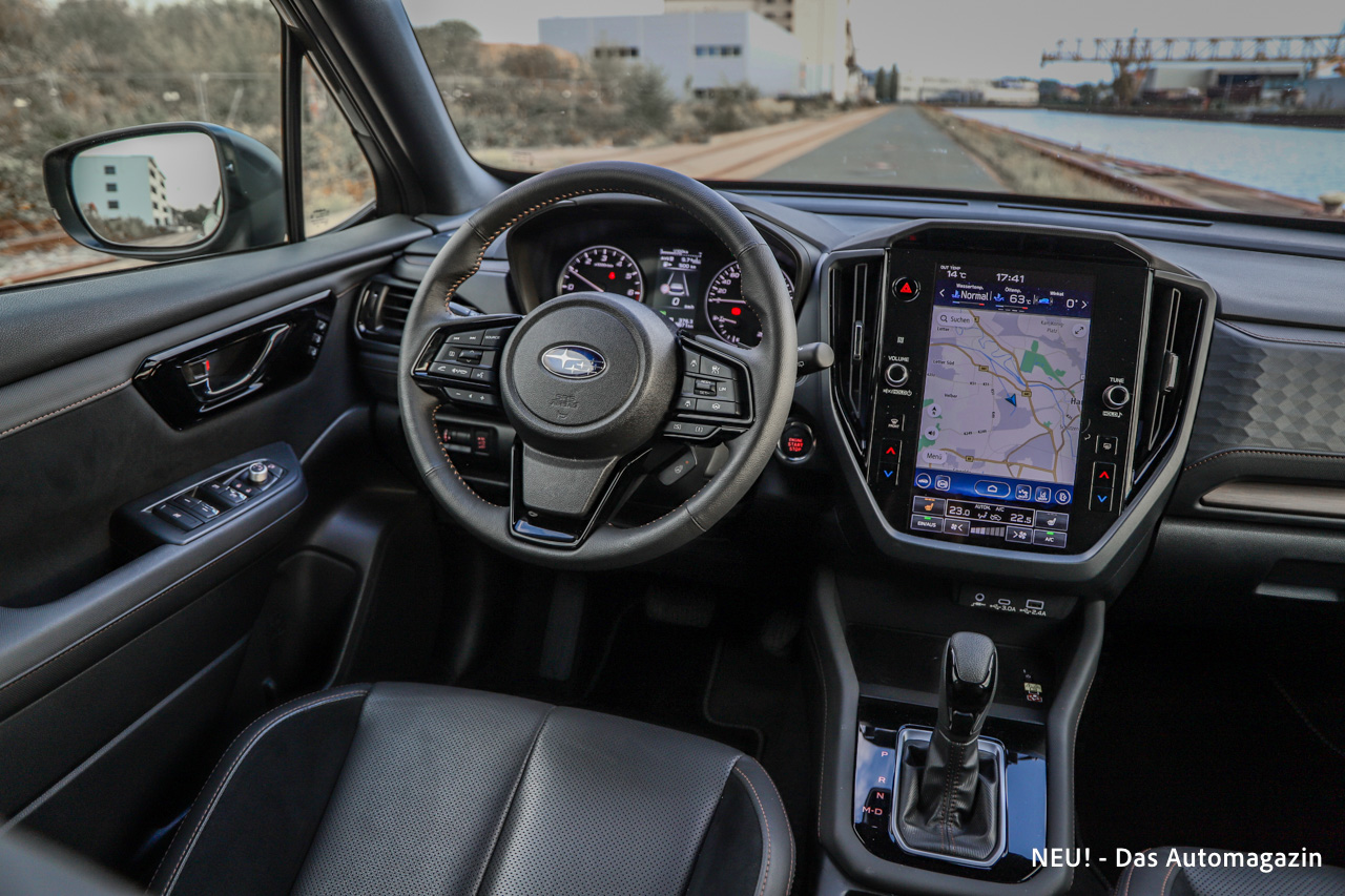 Besonders positiv fällt die Übersichtlichkeit auf. Große Glasflächen und eine vergleichsweise aufrechte Sitzposition ermöglichen eine sehr gute Rundumsicht, die Rangiermanöver auch ohne Rückgriff auf die serienmäßige 360-Grad-Kamera erleichtert. Gerade bei niedrigen Geschwindigkeiten oder in unübersichtlichen Parkhäusern wirkt der Forester dadurch deutlich zugänglicher als viele seiner Mitbewerber.