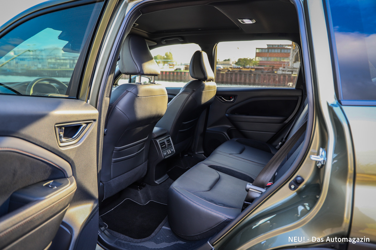 Unser Testwagen trat in der Ausstattungslinie Platinum an, lackiert in Autumn Green Metallic, einer Farbe, die das Outdoor-Selbstverständnis des Fahrzeugs visuell unterstreicht, ohne ins Rustikale abzurutschen. In Kombination mit den serienmäßigen 19-Zoll-Leichtmetallfelgen im Graphit-Ton entsteht ein Auftritt, der weniger urban-glatt als vielmehr zweckmäßig-modern wirkt. Schwarze Ledersitze mit braunen Kontrastnähten sowie ein elektrisch zu öffnendes Panorama-Glasschiebedach sind im Topmodell serienmäßig an Bord und zeigen, dass Subaru den Forester nicht ausschließlich als Nutzfahrzeug versteht.