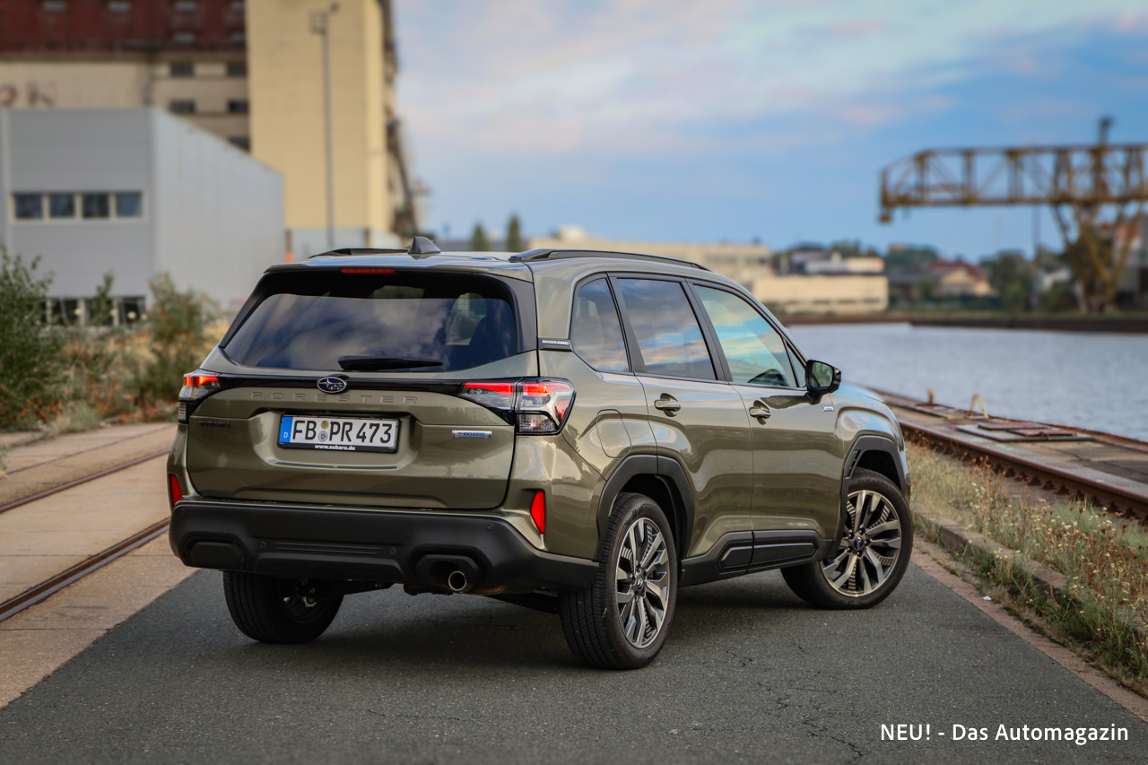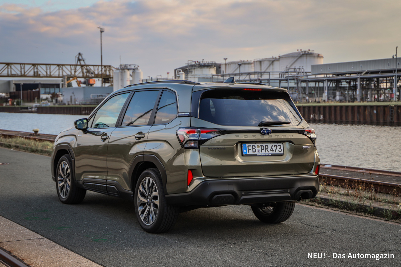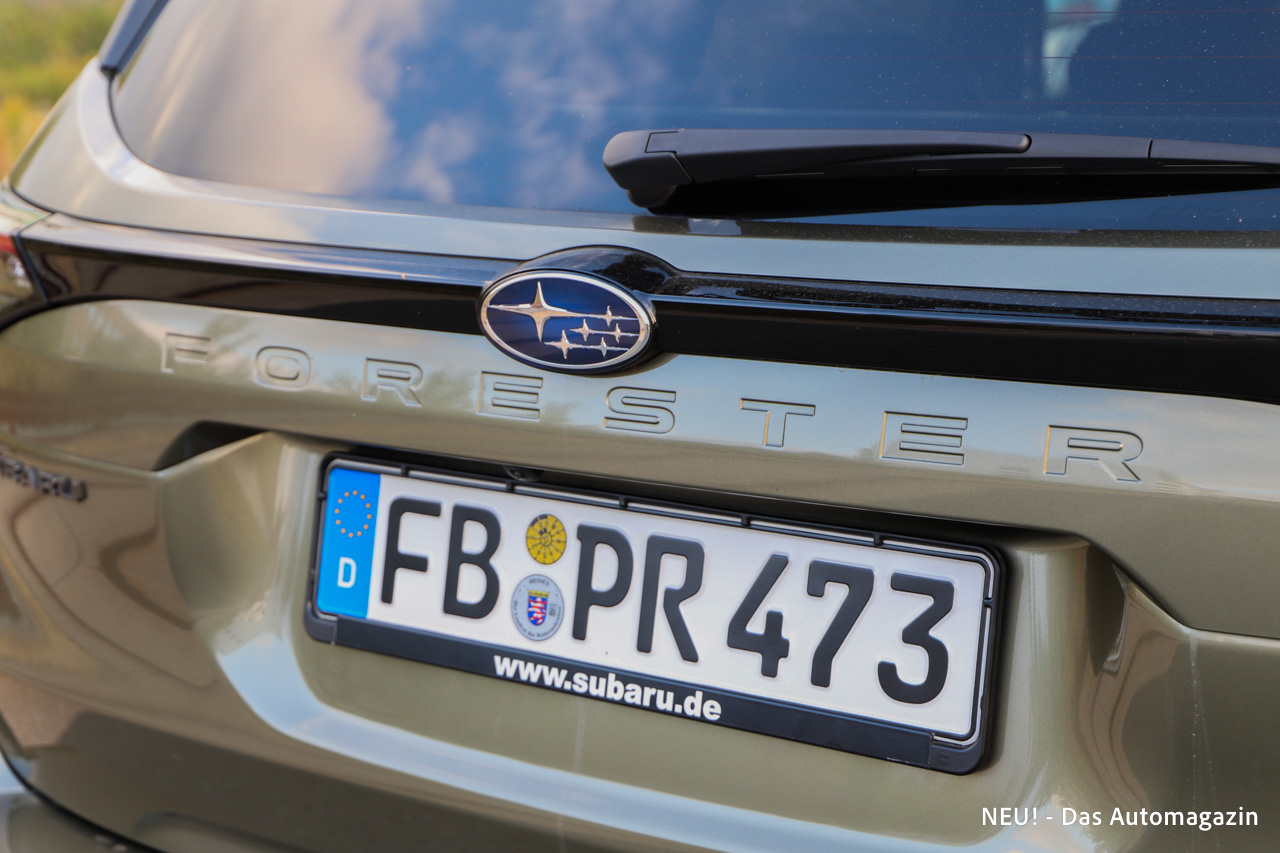 Am Heck setzt Subaru auf eine funktionale Interpretation moderner Designelemente. Die neu gezeichneten Rückleuchten sind filigraner als zuvor, bleiben jedoch ausreichend groß dimensioniert, um auch unter widrigen Sichtverhältnissen eine gute Erkennbarkeit zu gewährleisten. Eine dunkle Leiste verbindet beide Einheiten und sorgt für eine visuelle Breitenbetonung. Das weiterhin vorhandene Single-Endrohr signalisiert zudem, dass der Forester bewusst auf sportliche Inszenierung verzichtet.