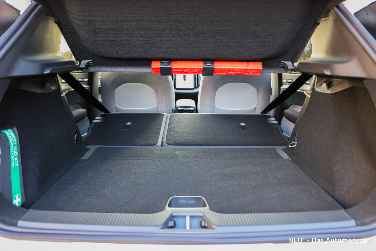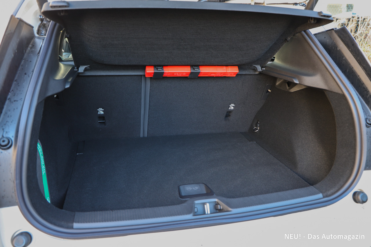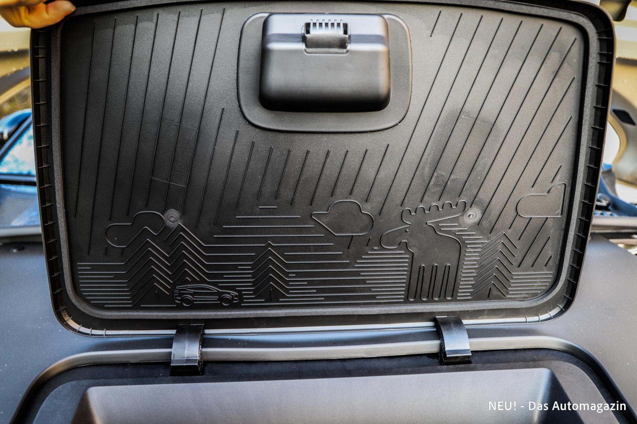Der Kofferraum bietet 318 Liter Volumen und liegt damit unter dem Klassendurchschnitt. Mit umgeklappter Rückbank erweitert sich das Ladeabteil auf rund 1.000 Liter. Positiv fällt die ebene Ladefläche auf, die den Transport größerer Gegenstände erleichtert. Ergänzt wird das Raumangebot durch einen kleinen Frunk unter der vorderen Haube, der allerdings eher symbolischen Charakter hat und kein Ladekabel aufnimmt.
