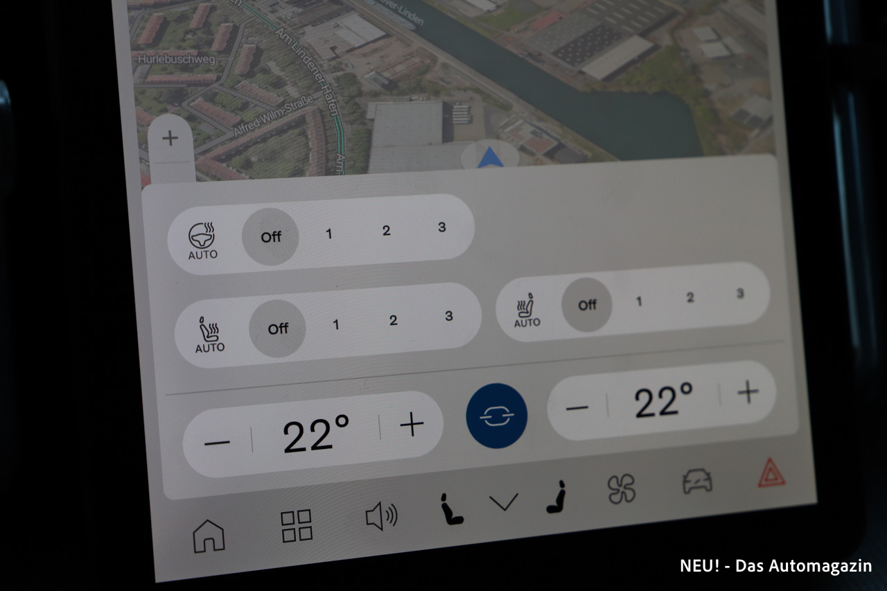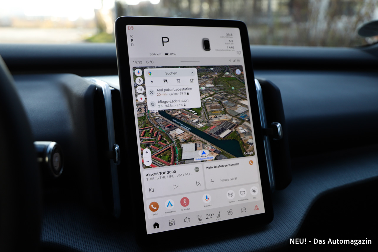 Das Infotainment basiert auf Android Automotive und integriert Google-Navigation, Sprachsteuerung sowie App-Dienste. Die Reaktionsgeschwindigkeit ist hoch, insbesondere nach dem Fahrzeugstart. Dennoch erfordert die Menüstruktur Eingewöhnung, da viele Funktionen tief verschachtelt sind und während der Fahrt Aufmerksamkeit binden können.