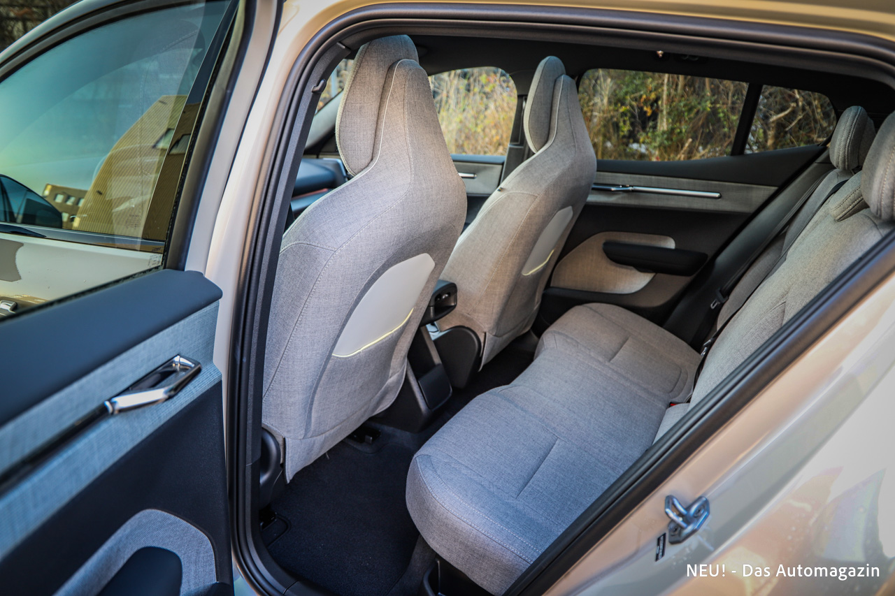 Materialseitig überzeugt der EX30 mit einer hochwertigen Anmutung. Viele Oberflächen bestehen aus recycelten Materialien, die dennoch solide verarbeitet sind und sich angenehm anfühlen. Die Sitze bieten guten Halt und ausreichende Polsterung, auch auf längeren Strecken. Vorn ist das Raumgefühl überraschend luftig, im Fond fällt die Beinfreiheit hingegen etwas knapper aus. Für Erwachsene ist es ausreichend, für längere Fahrten jedoch eher durchschnittlich.
