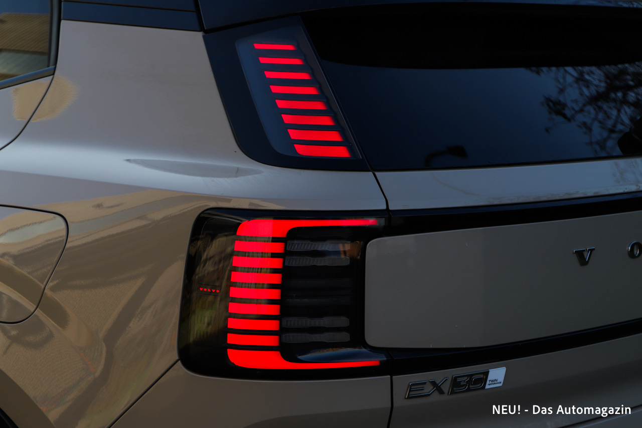 Die LED-Scheinwerfer mit der markentypischen Thor’s-Hammer-Signatur sorgen für einen hohen Wiedererkennungswert, ohne aufdringlich zu wirken. Auch das Heck bleibt klar strukturiert, mit vertikal orientierten Rückleuchten, die den Volvo-Charakter sofort erkennen lassen. Insgesamt wirkt der EX30 eher wie ein bewusst reduziertes Designobjekt als wie ein klassisches Lifestyle-SUV.
