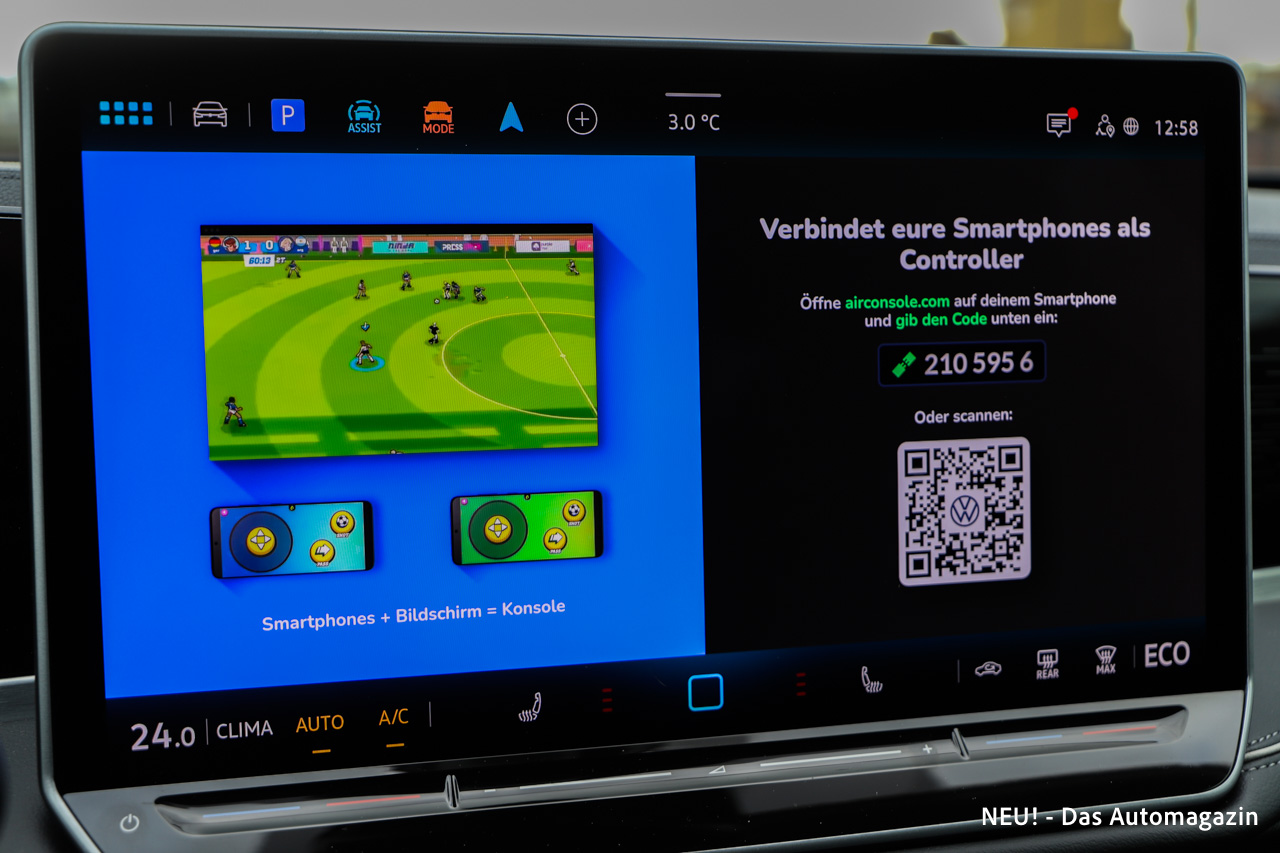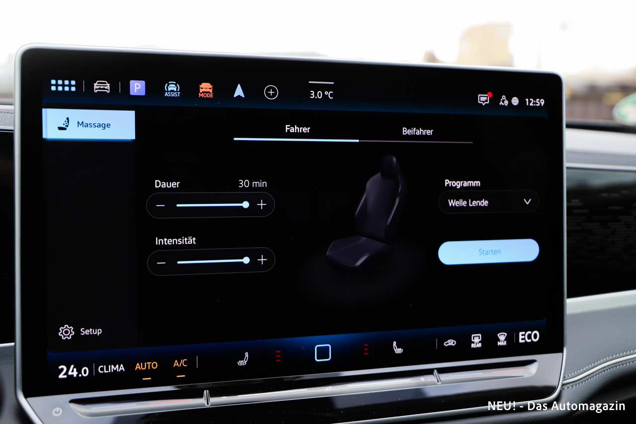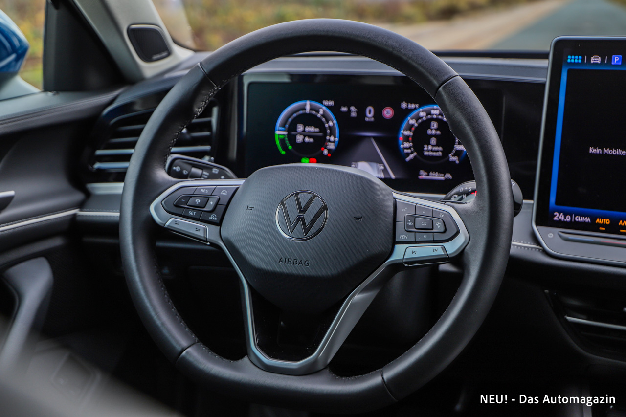 Der Innenraum des VW Passat eHybrid wirkt wie eine Einladung, länger zu bleiben als nötig. Das Cockpit öffnet sich großzügig, fast schon loungeartig, ohne die Funktion aus dem Blick zu verlieren. Der große zentrale Bildschirm dominiert optisch, doch der Innenraum lebt von der Balance aus Digitalfläche und handfesten Bedienelementen. VW verzichtet hier auf die Sensorflächen vergangener ID-Modelle und setzt wieder stärker auf echte Tasten am Lenkrad.