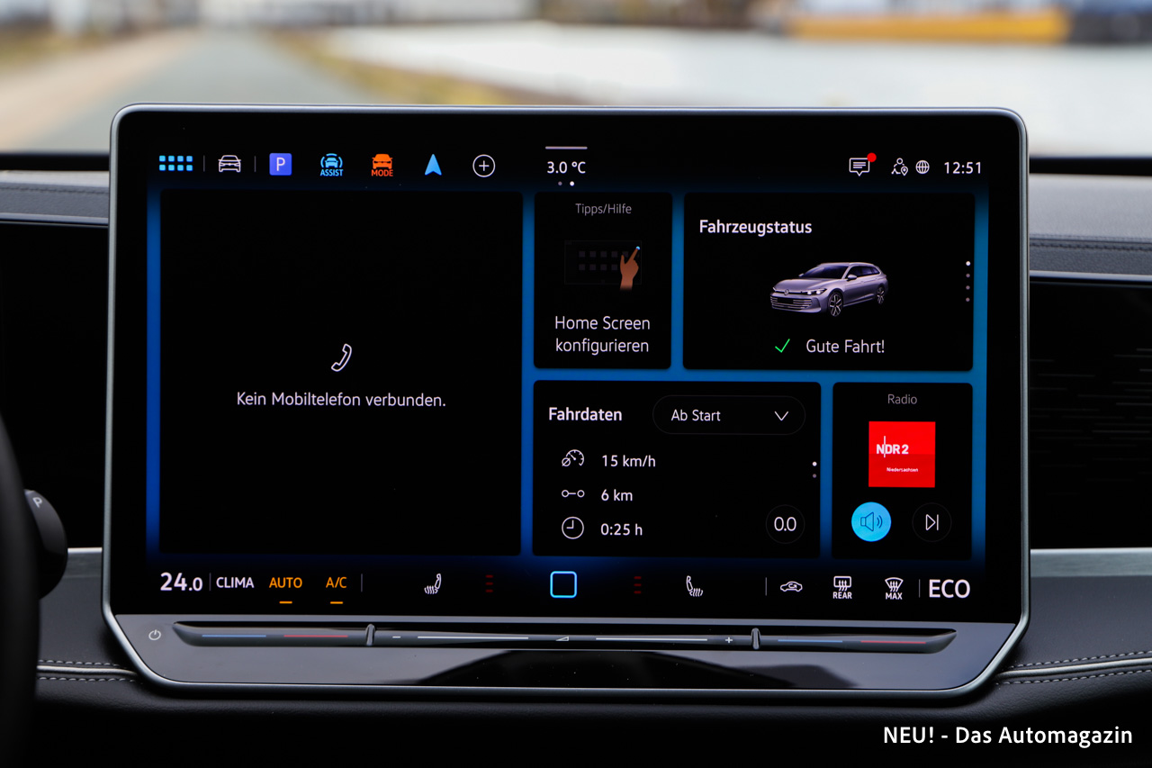 Interessant ist, wie breit das Technikangebot gestaffelt wurde. Wer möchte, kann den Passat mit Optionen ausstatten, die früher ausschließlich der Oberklasse vorbehalten waren. Das betrifft nicht nur das HUD, sondern auch Komfortfunktionen wie Sitzbelüftung oder die erweiterte Ambientebeleuchtung. Der Parkassistent arbeitet präzise und steuert den Kombi auch in enge Lücken, sofern die Markierungen klar sind. Die Sprachassistenz IDA reagiert natürlicher als frühere Systeme, auch wenn sie gelegentlich am Dialekt scheitert. Die Sensorik rund um den Wagen schafft eine angenehme Sicherheit, ohne den Fahrer zu bevormunden. Insgesamt wirkt der technische Aufbau des Passat nicht wie ein Experimentierfeld, sondern wie ein gereiftes Portfolio, das bewusst auf Alltagstauglichkeit ausgelegt wurde.