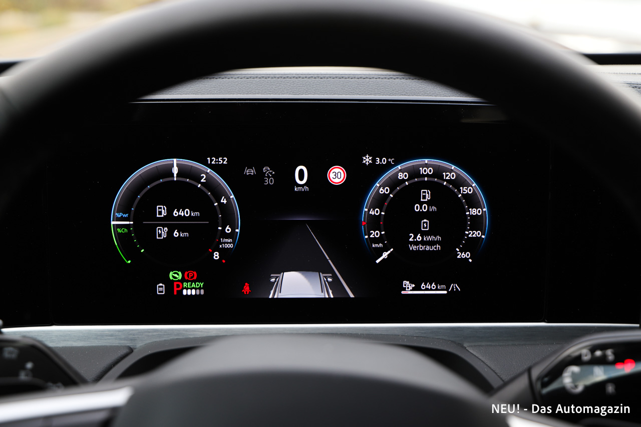 Im Alltag zeigt der VW Passat eHybrid, wie sehr diese Antriebstechnik von Nutzungsprofilen abhängt. Der kombinierte elektrische Betrieb funktioniert überzeugend, solange das Auto regelmäßig geladen wird. Die WLTP-Reichweite von rund 132 Kilometern ist unter Idealbedingungen erreichbar, doch im Winter fällt sie deutlich geringer aus. Unser Testwagen kam bei niedrigen Temperaturen etwa 70 Kilometer weit, bevor der Verbrenner übernehmen musste.