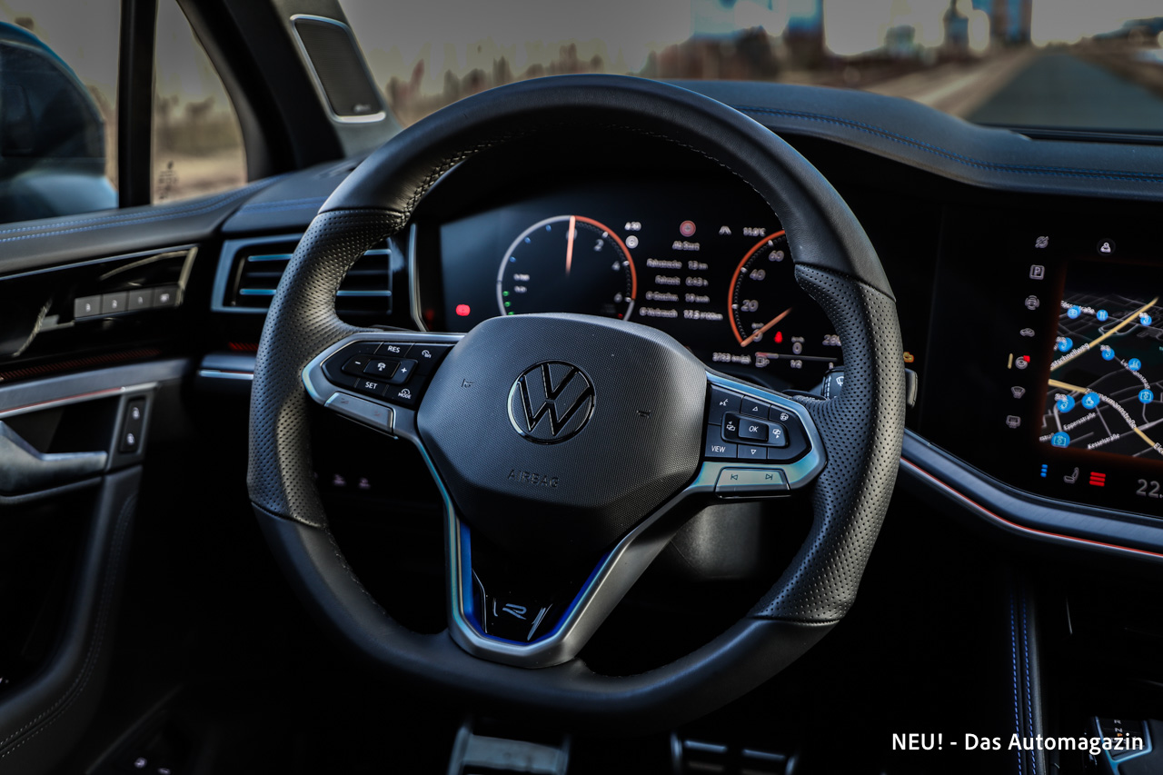 Beim Materialeindruck spielt der VW Touareg R Facelift seine Reife aus. Die Oberflächen sind weich, die Verarbeitung präzise, die Haptik stimmig. R-spezifische Akzente setzen punktuell den sportlicheren Ton, ohne den Charakter eines Luxus-Reisers zu überzeichnen. Entscheidend ist: Der Touareg will nicht wie ein Sportler wirken – er will als großes, teures Auto selbstverständlich wirken.