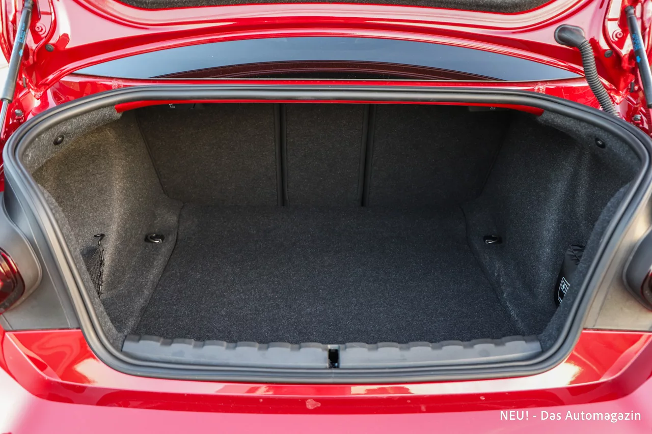 Ein wichtiger Helfer im Alltag ist die ausgezeichnete Rückfahrkamera, die wegen der eingeschränkten Sicht nach hinten unverzichtbar ist. Das Infotainment arbeitet modern und flüssig, Android Auto und Apple CarPlay laufen kabellos. Auch der Kofferraum mit 390 Litern liefert mehr Nutzen, als man einem solchen Sportgerät zutrauen würde.