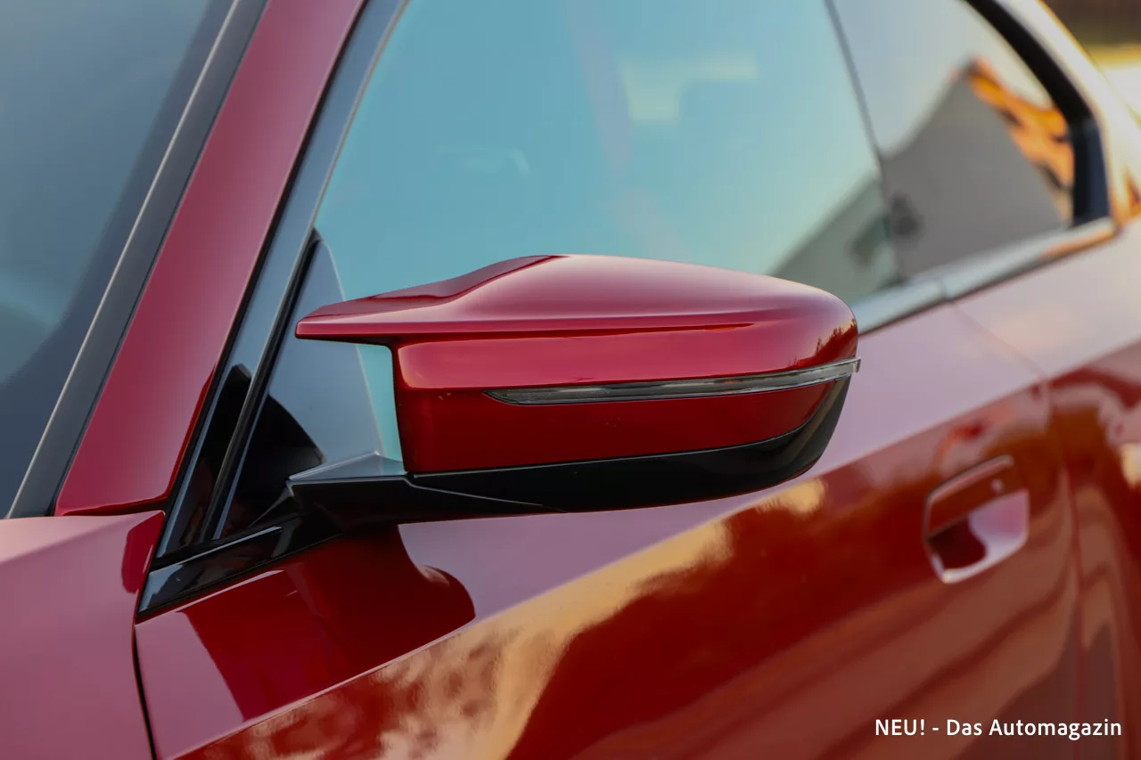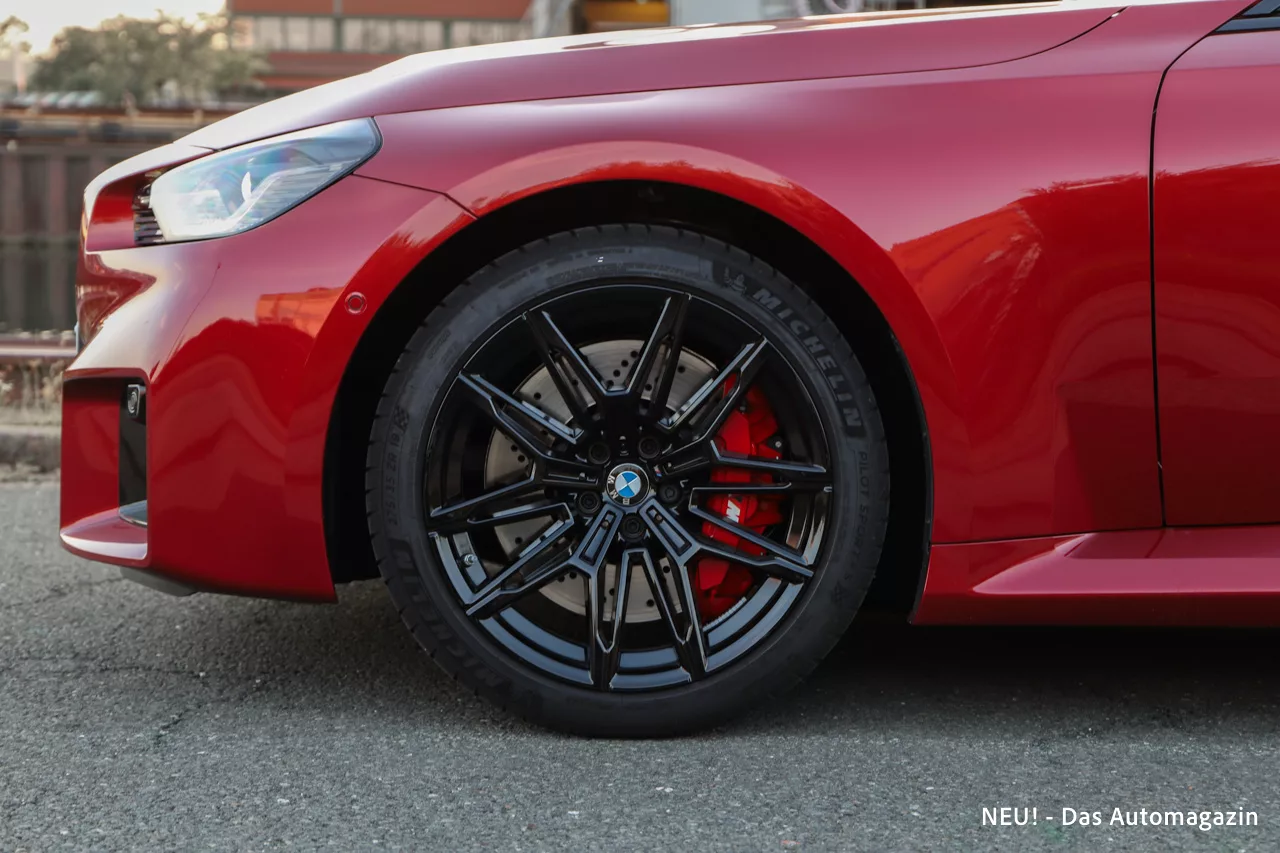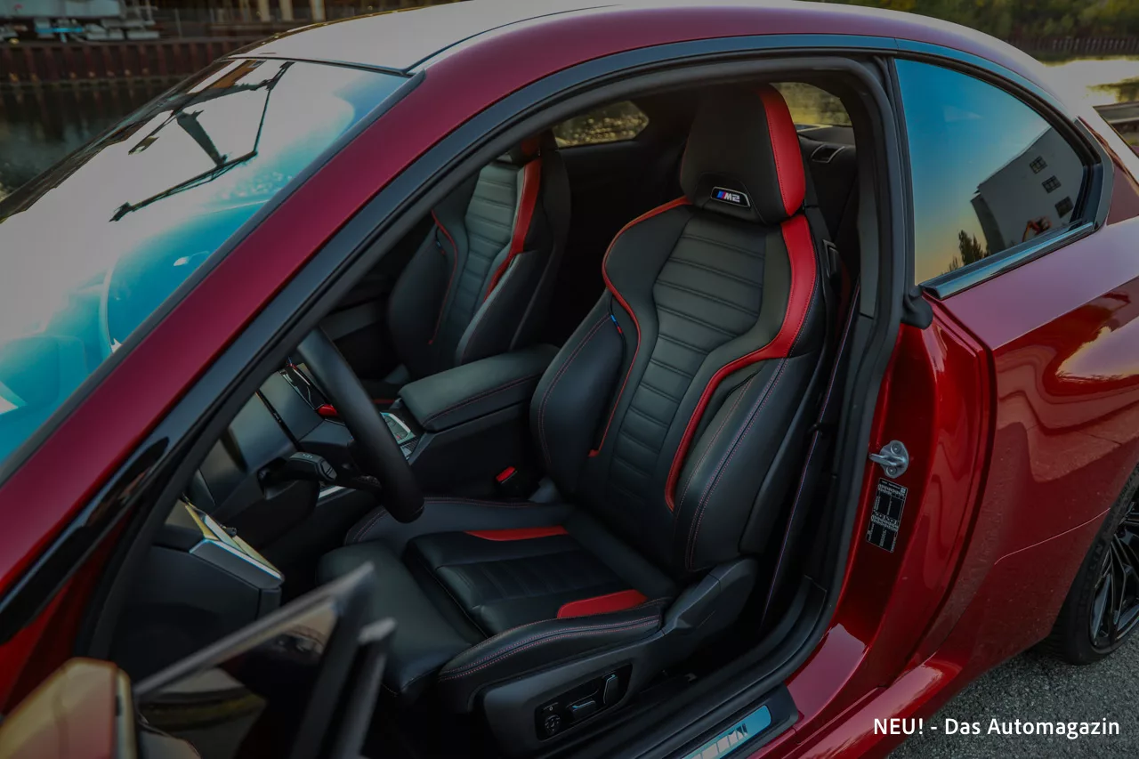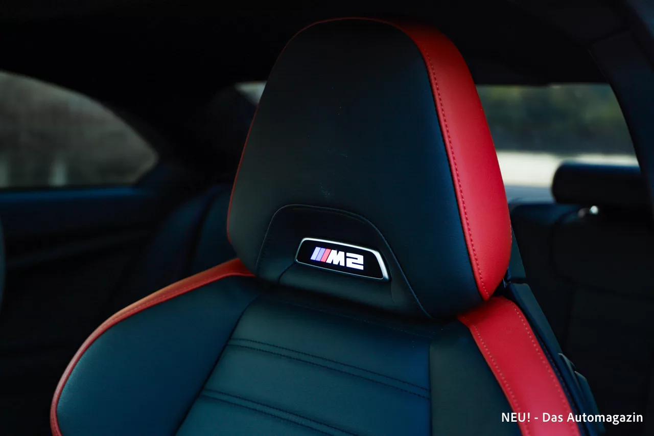 Fire Red Metallic macht daraus eine Bühne. Die Farbe ist intensiv und lebendig, ohne die Seriosität zu verlieren, die ein echter M ausstrahlen soll. Im Sonnenlicht leuchtet sie mit enormer Tiefe, während sie bei Dämmerung betont satt und druckvoll wirkt. Auf Bildern lässt sich dieser Effekt nur schwer einfangen. In der Realität aber gehören Blicke und hochgezogene Augenbrauen zum Standardprogramm. Der M2 im Fire Red ist kein Auto, das im Verkehr verschwindet. Er tritt auf, und zwar mit voller Stimme.
