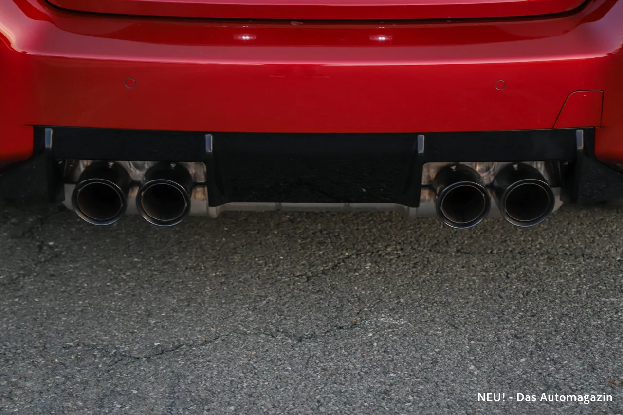 Am Heck erreicht die Dramatik ihren Höhepunkt. Die Vierrohr-Abgasanlage sitzt weit außen, fest eingerahmt von einem kantigen Diffusor, der im Gegensatz zu vielen modernen Performancewagen nicht nach Show aussieht, sondern stimmig integriert wirkt. Die Heckleuchten ziehen sich energisch in die Flanken, und die breite Spur lässt den M2 auftreten, als wolle er die Straße für sich allein beanspruchen.