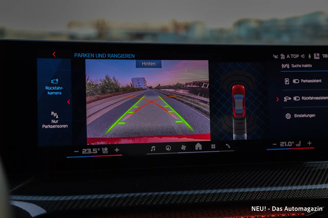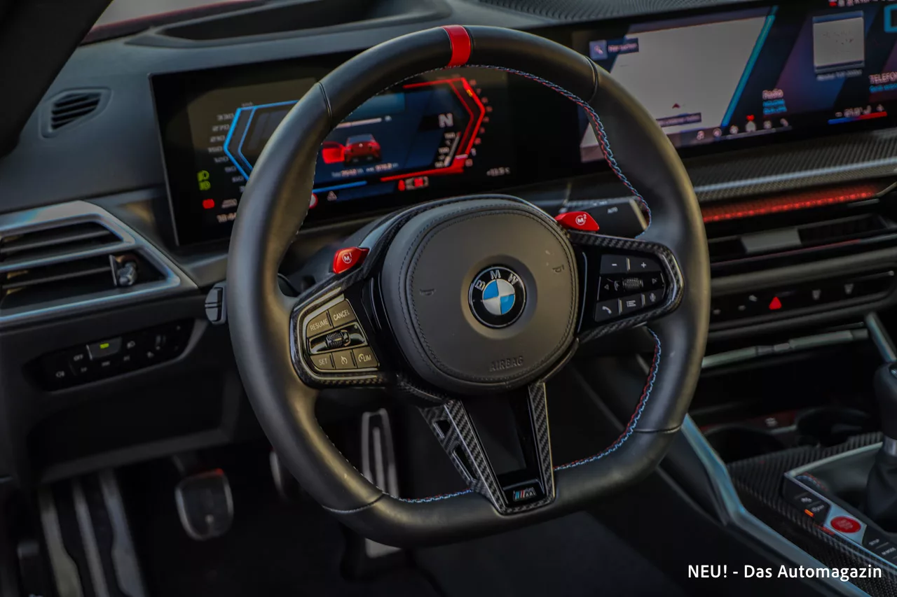 Materialqualität und Verarbeitung bewegen sich auf typisch hohem BMW-Niveau. Die Carbon-Interieurleisten unseres Testwagens schaffen Rennsportassoziationen, ohne übertrieben zu wirken. Die M-Farben in den Türverkleidungen – subtil bei Tag, leuchtend bei Nacht – setzen einen spielerischen, fast ikonischen Akzent. Das dick gepolsterte M-Lenkrad wirkt wertig, dürfte für manche Puristen aber gern etwas schlanker ausfallen.