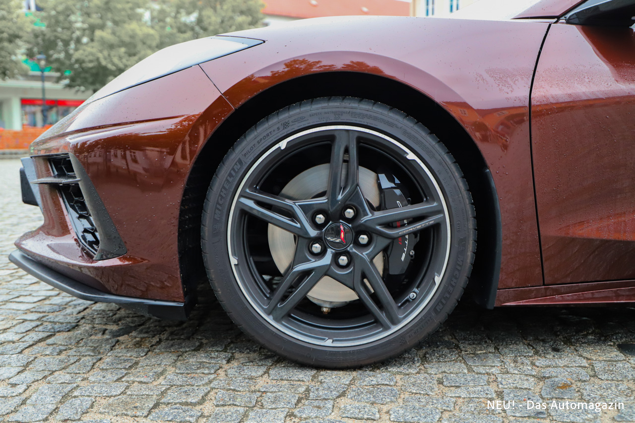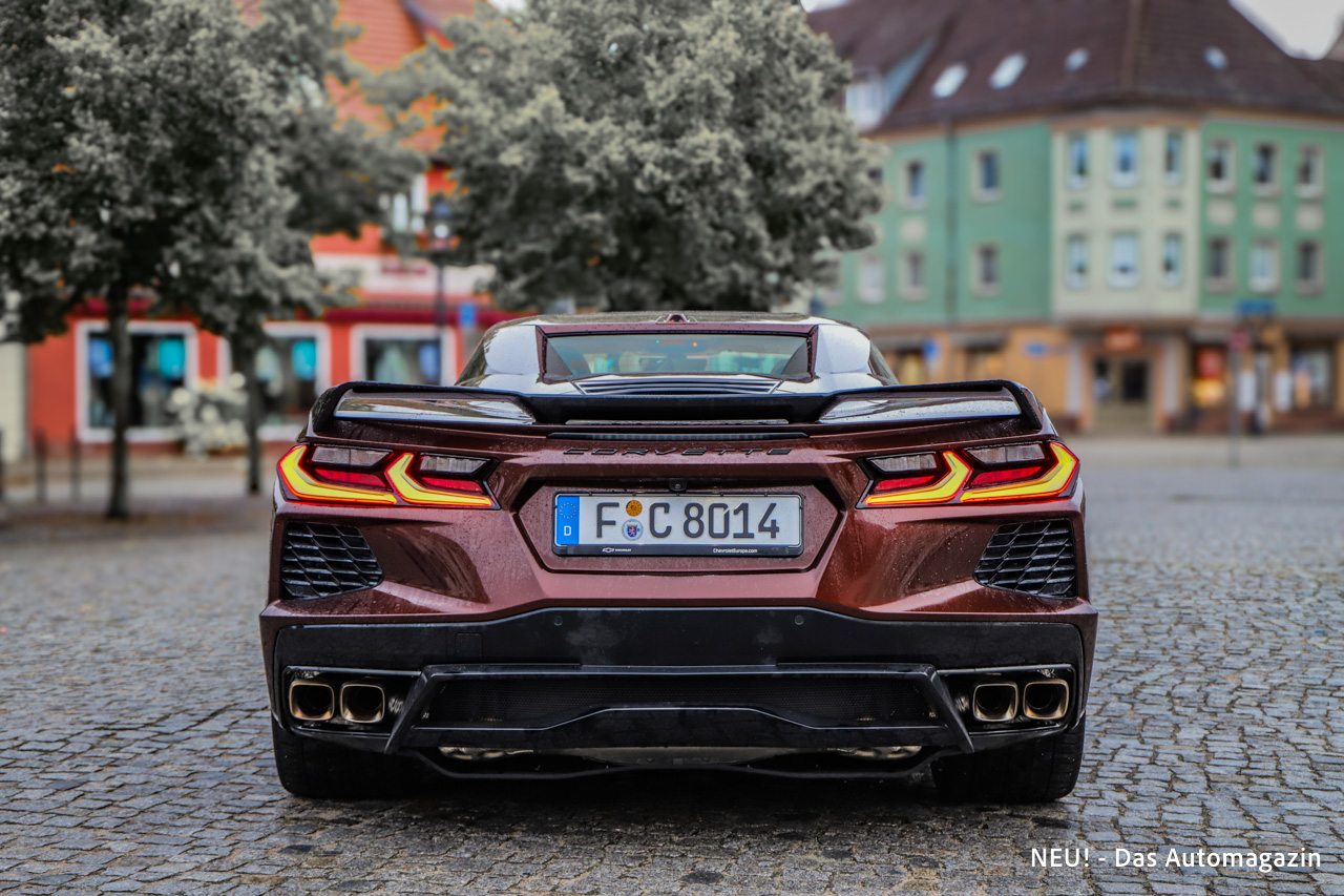 Am Heck bleibt ein Rest DNA früherer Generationen sichtbar. Die Leuchten zitieren noch die typische Corvette-Signatur, während die vier Endrohre nun weiter außen positioniert sind und das neue Layout betonen. Darüber hinaus unterstreichen 19-Zoll-Räder vorne und 20-Zoll-Räder hinten den Keilform-Eindruck.