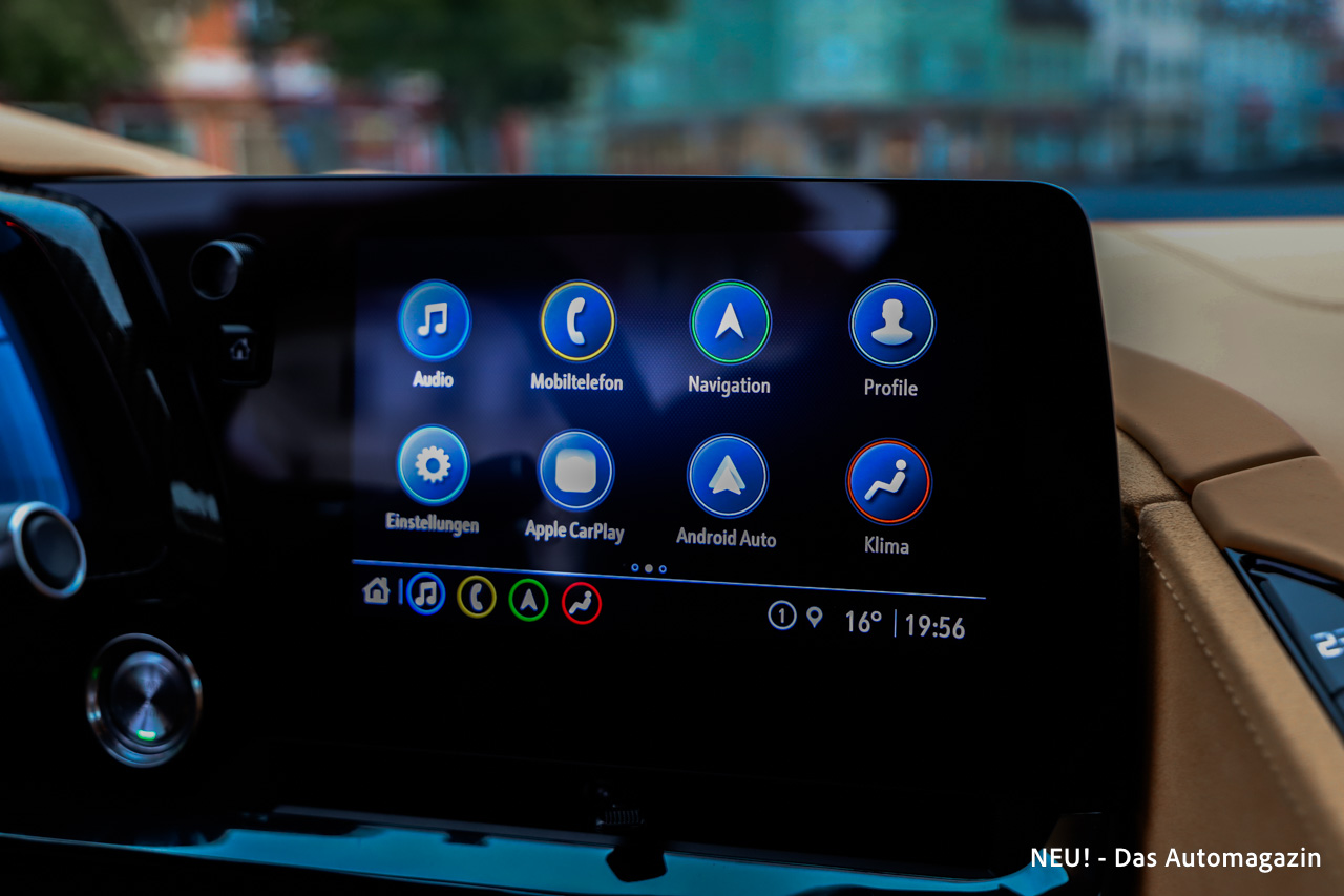 Das Infotainmentsystem ist permanent online und bietet eine klar strukturierte Benutzeroberfläche mit schneller Routenberechnung und zuverlässiger Sprachführung. Apple CarPlay und Android Auto lassen sich kabellos koppeln, was dem Innenraum eine moderne Konnektivität verleiht. Die Bedienung erfolgt über den zentralen Touchscreen sowie über klassische Tasten und Drehregler entlang der markanten Mittelkonsole, die Fahrer und Beifahrer voneinander trennt. Dieses Bedienkonzept wirkt ungewöhnlich, ist nach kurzer Eingewöhnung jedoch logisch und gut erreichbar.