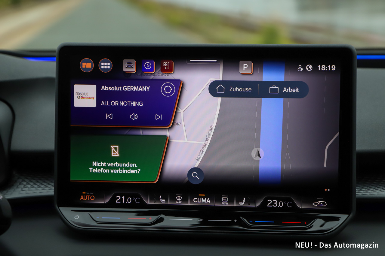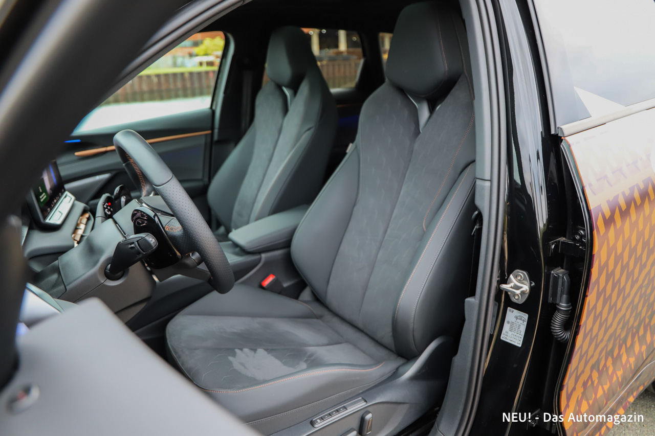 Im Innenraum wechselt der Cupra Terramar VZ ABT wieder ins Bekannte und zeigt, dass Cupra die Balance aus Sportlichkeit und Alltag sehr gut beherrscht. Die Gestaltung orientiert sich stark am regulären VZ, weshalb die meisten Elemente vertraut wirken. Kupferfarbene Akzente laufen über Lüftungsdüsen, Ziernähte, Lenkrad und Türgriffe. Sie schaffen einen warmen Kontrast zum ansonsten dunklen Grundton, der klar strukturiert wirkt. Das zentrale Infotainment bleibt der optische Mittelpunkt des Cockpits. Der große Bildschirm erinnert an ein Tablet und bietet eine moderne Darstellung, auch wenn die Bedienung teils noch von den bekannten Touch-Empfindlichkeiten der Konzernarchitektur geprägt ist.