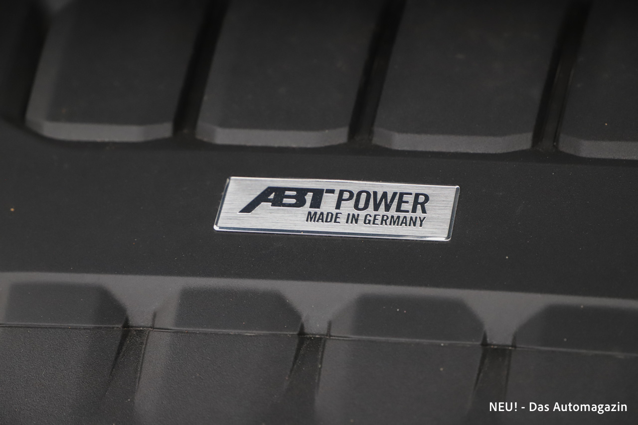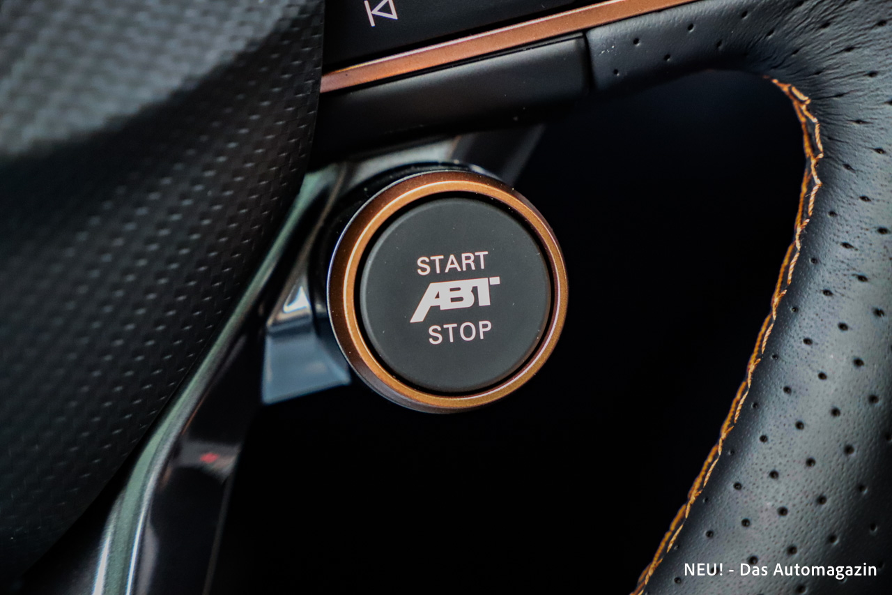 ABT selbst hält sich im Innenraum erstaunlich zurück. Ein Startknopf mit ABT-Schriftzug sowie Folienelemente auf den Spiegelgläsern bilden die wenigen Hinweise auf das Tuningpaket. Kleine Plaketten oder modifizierte Einstiegsleisten würden hier gut hineinpassen, bleiben aber aus. Dennoch bleibt der Gesamteindruck hochwertig und sportlich. Die Sportsitze tragen ihren Anteil dazu bei und bieten dank ihrer ausgeprägten Form guten Halt. Die verwendeten Materialien aus Velours und Lederimitat fühlen sich angenehm an und wirken robust genug für den Alltag.