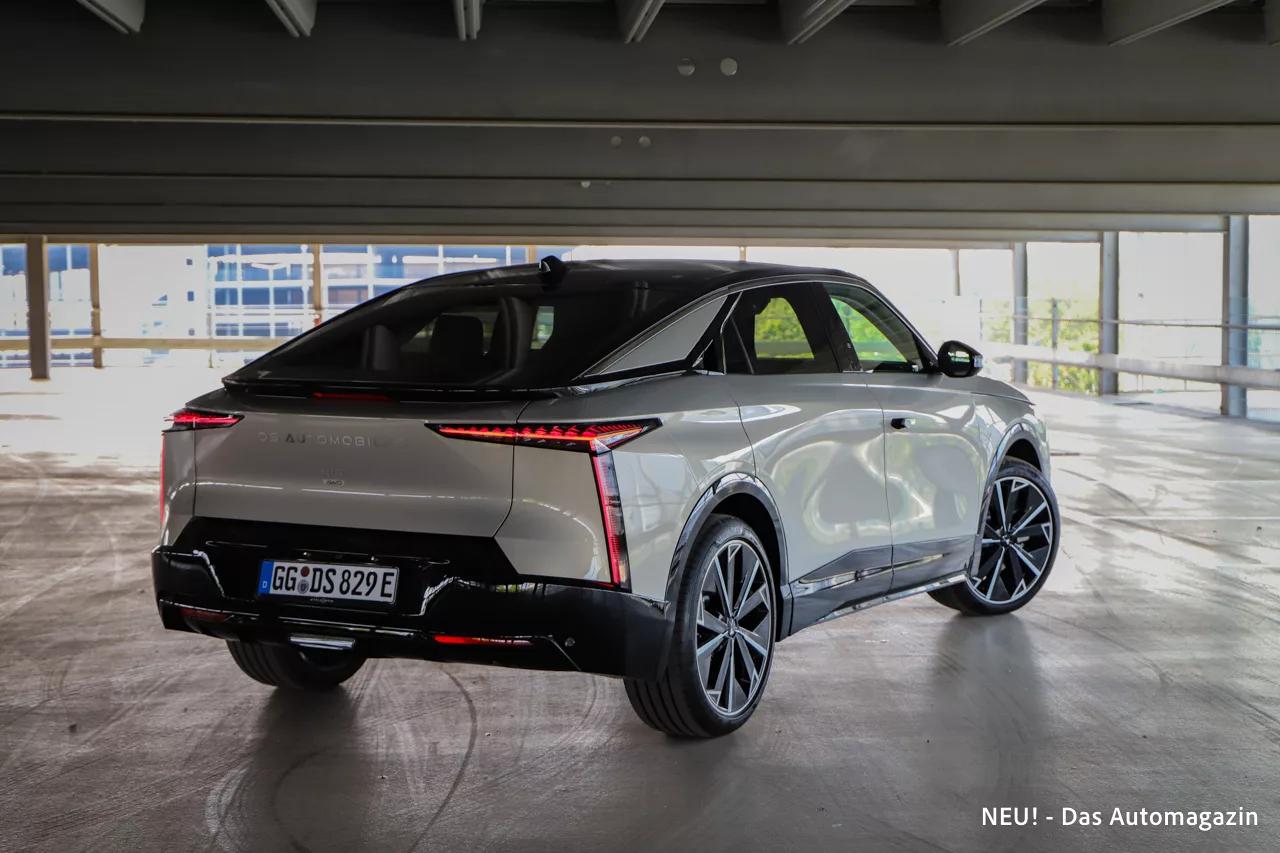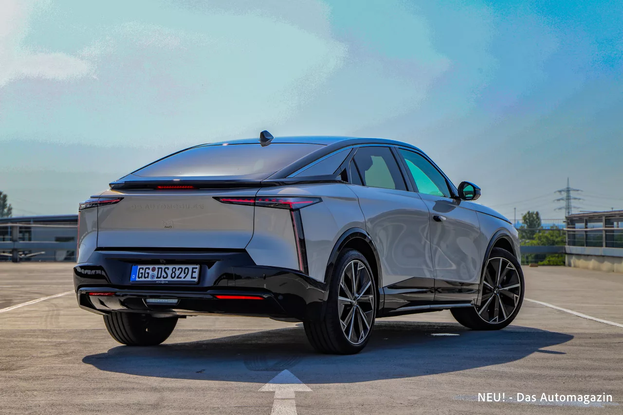 Hinten zieht sich ein durchgehendes Lichtband über das Heck, flankiert von schmalen LED-Einheiten, die nachts wie Juwelen glimmen. Darunter: eine betont klare, fast minimalistische Fläche, die Ruhe und Selbstbewusstsein ausstrahlt. Der DS-Schriftzug prangt dezent, aber unmissverständlich.