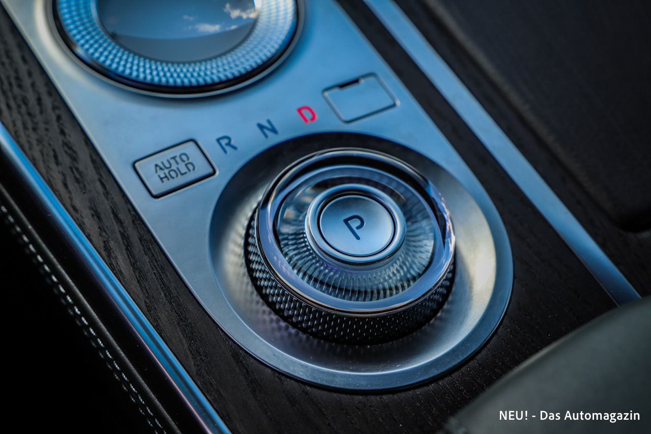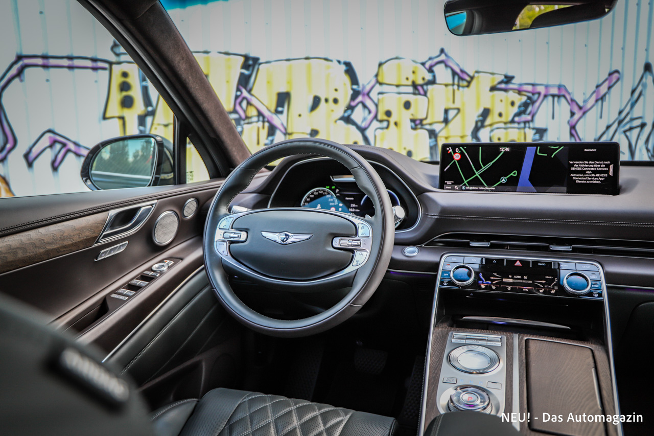Der Innenraum des Luxus-SUV ist eine Welt für sich. Eine Mischung aus moderner Handwerksästhetik und digitaler Eleganz, wie man sie in dieser Konsequenz selten erlebt. Die Materialien wirken ausgesucht, teils luxuriös, teils bewusst zurückhaltend, sodass das Gesamtbild wie ein hochwertig eingerichteter Salon erscheint. Genesis gelingt hier etwas, das man in der Premiumklasse nicht kaufen, sondern nur entwerfen kann. Glaubwürdige Noblesse. Die breite Mittelkonsole trennt Fahrer und Beifahrer wie eine Kommandobrücke, ohne einzuengen, und die klare Linienführung sorgt dafür, dass der Innenraum trotz aller Ausstattung nie überladen wirkt.
