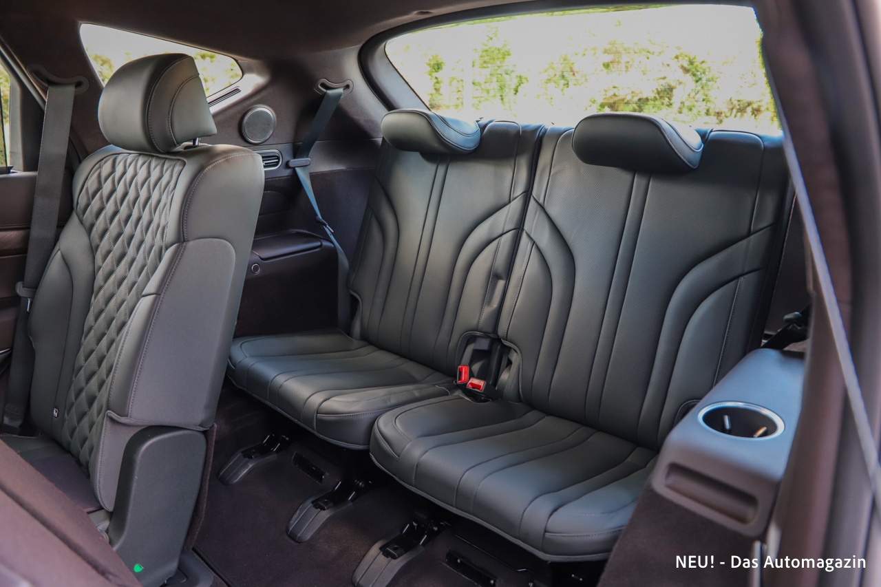 Die vorderen Sitze sind ein Kapitel für sich. Zwölffach elektrisch verstellbar, klimatisiert und mit adaptiven Seitenwangen, die sich je nach Fahrmodus enger anlegen oder öffnen. Es ist spürbar, dass der GV80 weniger Sportlichkeit als vielmehr exzellenten Langstreckenkomfort bieten möchte. Der Fond bietet üppige Platzverhältnisse, auch wenn die Beinfreiheit nicht ganz das Niveau eines X5 oder GLE erreicht. Dafür punktet der GV80 mit cleveren Details wie verstellbaren Lehnen und optional verschiebbaren Sitzreihen, was den praktischen Wert im Alltag deutlich steigert.